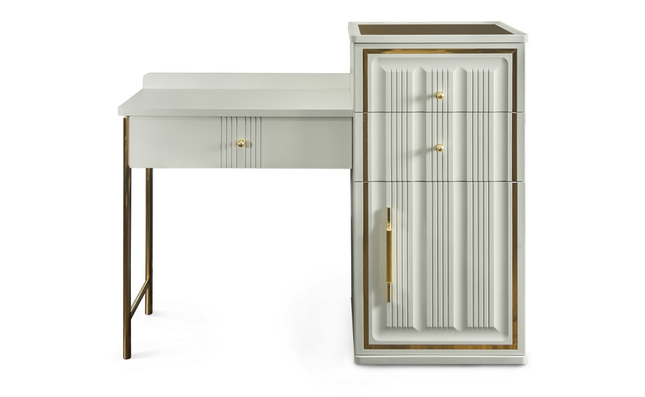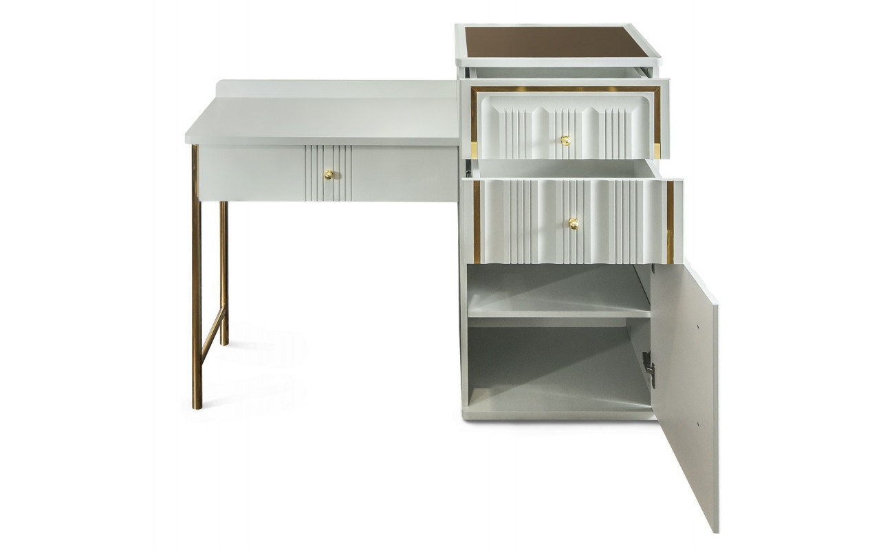 Материал корпусаЛДСП Kronospan 16 мм | Материал фасадаФасад МДФ с фрезеровкой и вставкой из пластика под латунь | Материал СтолешницыСтол - МДФ, столешница тумбы -МДФ с вставкой из калёного стекла |