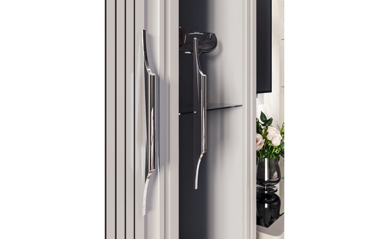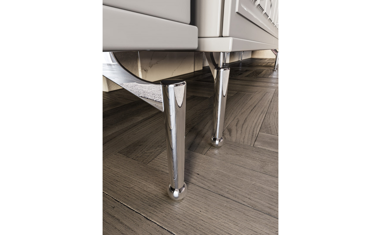 Материал фасадаМДФ с фрезеровкой и вставкой из пластика под латунь/хром + стеклянная дверь с фрезеровкой МДФ; Стекло: С тонировкой бронзато | Материал ножекИз металла, пр-во Турция; (как у прикроватной тумбы) | ФурнитураGTV (Италия) с доводчиками |