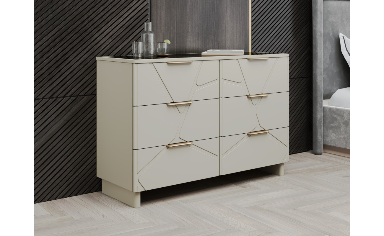 Каждая деталь спальни тщательно продумана, чтобы подарить вам не только максимальный комфорт и эстетическое удовольствие, но и уверенность в высоком качестве мебели. Корпуса и столешницы модулей выполнены из ламинированной древесной плиты европейского качества, Фасады из природного МДФ задекорированы рельефной фрезеровкой и авторский стиль фабрики ЭРА — это финишное покрытие матовая итальянская эмаль ярко серого цвета.