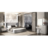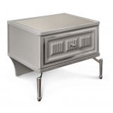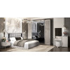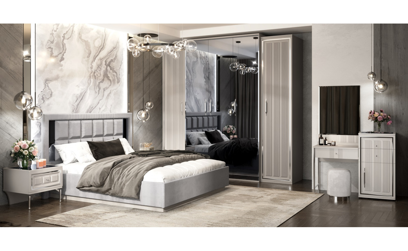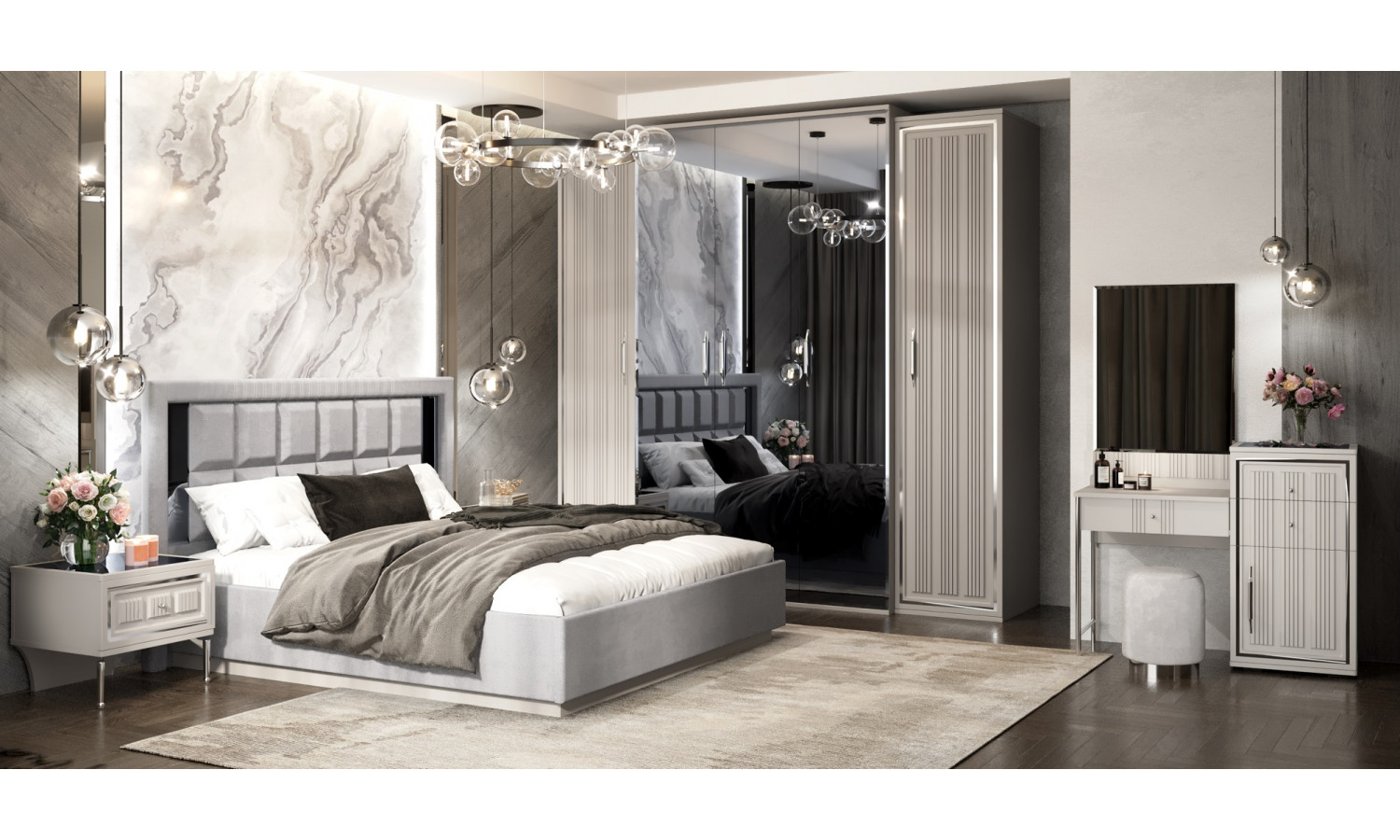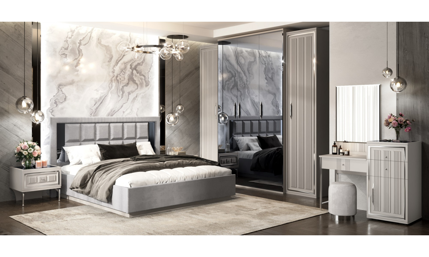 Прикроватные тумбочки с эффектом парения, туалетный стол на лёгких металлических опорах с топами из крашеного итальянской эмалью МДФ с модным декором стеклянной бронзированной поверхностью выгодно подчеркнут стиль спальни.