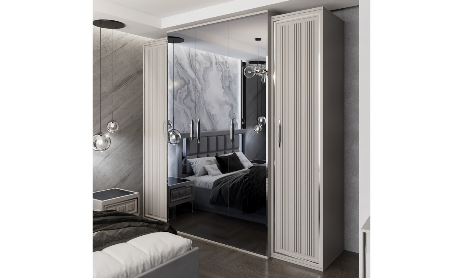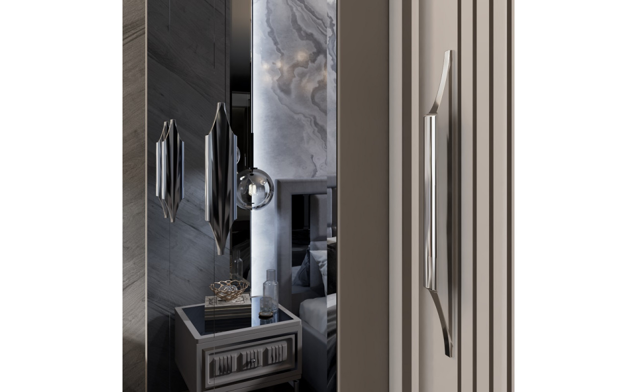 Фасады оснащены фурнитурой с доводчиком и украшены металлизированным латунным декором — этот тренд сезона является авторским стилем фабрики Эра и такой же декор используется в спальне Lara – это расширяет возможности и позволяет миксовать коллекции новинок.