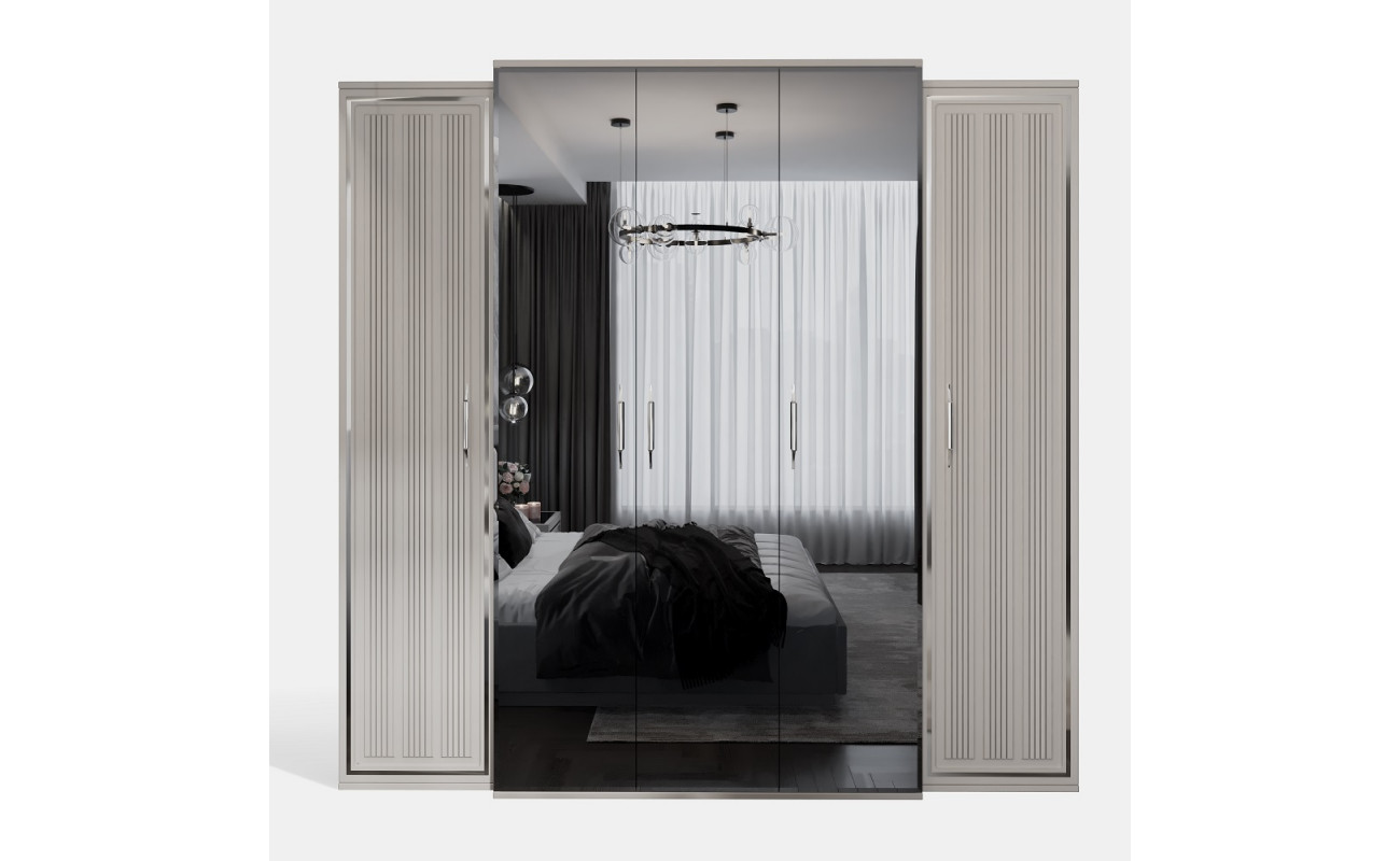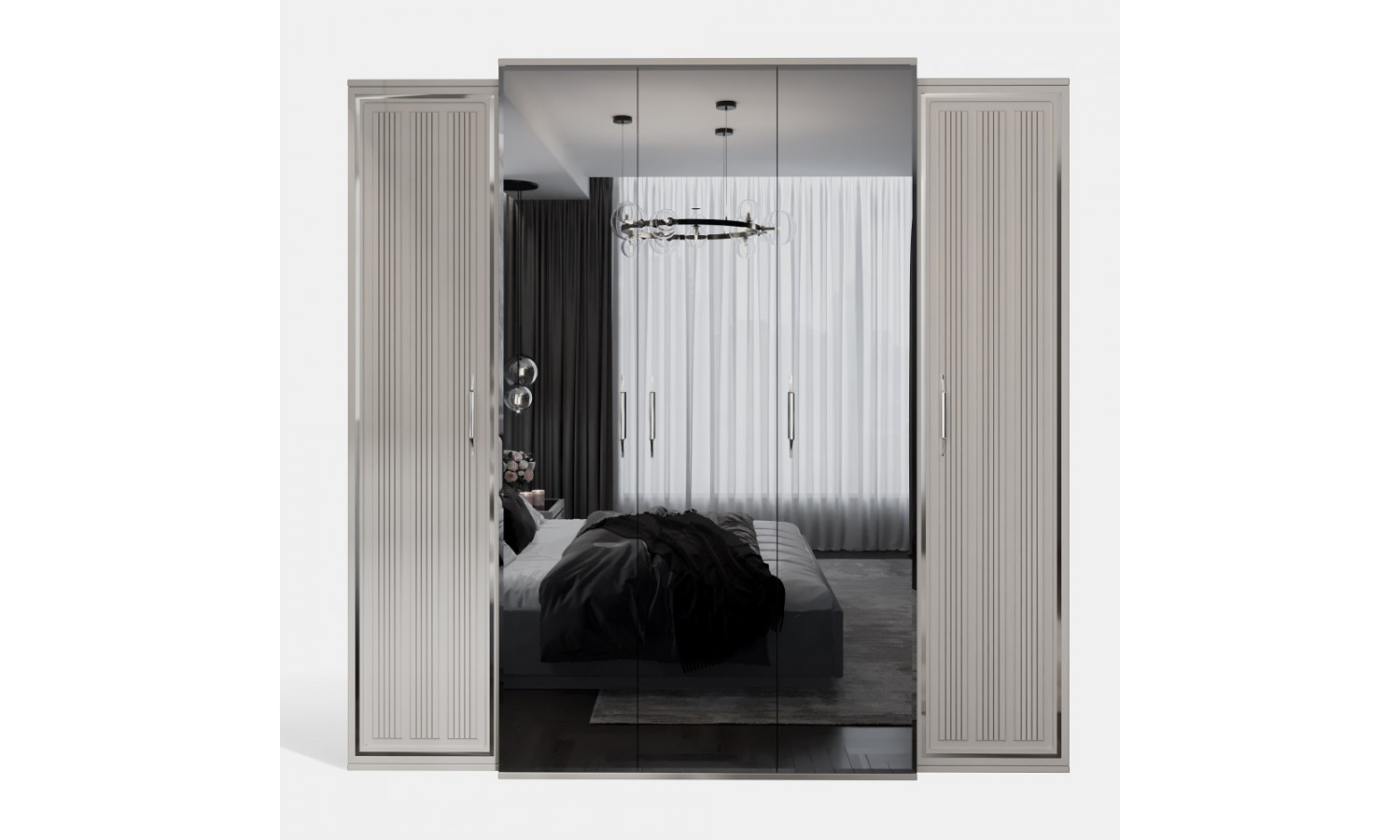 Шкаф с центральным портальным элементом это секция с зеркалами бронзато отличается по габаритам от крайних секций с фрезерованными фасадами крашенного МДФ. Такая конструкция является и эстетическим решением — не перегружает пространство и функциональный вариант — в центральной секции расположены штанги, а в завершающих полки для белья. Внутреннее наполнение шкафа выполнено по стандартам гардеробной и укомплектован полки для белья и штанга для одежды.