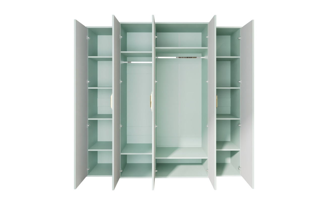 | Наполнение | Шкаф разделен на 4 секции (1+2+1+1), крайние 1ств - 4 полки, 2х и 1 ств. средние - 2 полки, 1 штанга |