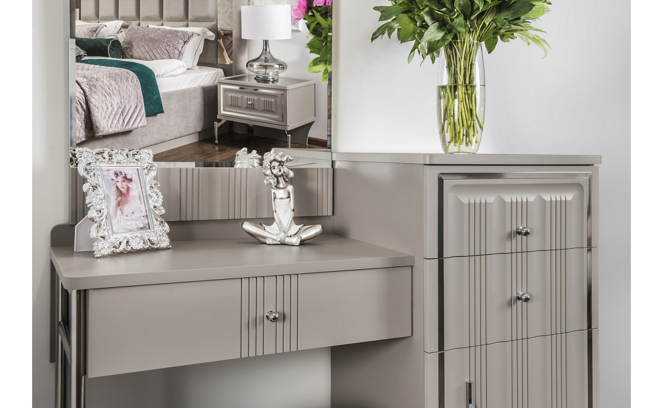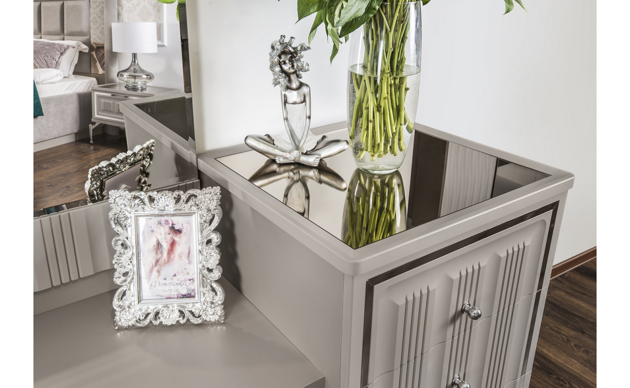 Прикроватные тумбочки с эффектом парения, туалетный стол на лёгких металлических опорах с топами из крашеного итальянской эмалью МДФ с модным декором стеклянной бронзированной поверхностью выгодно подчеркнут стиль спальни.