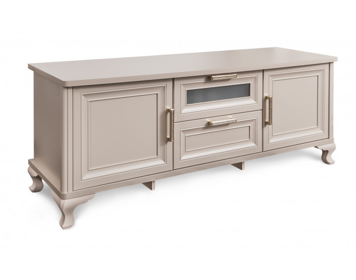 МОККО — это гостиная с панорамными витринами и тумбой тв на изящных ножках. Гладкая поверхность, декор на стеклах и латунные ручки со стразами, в которых переливаются лучи света.