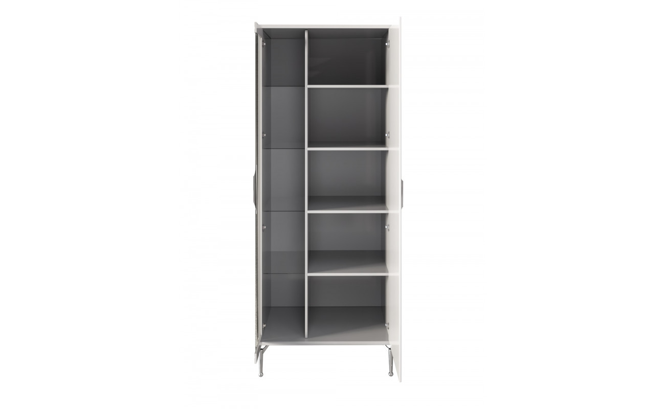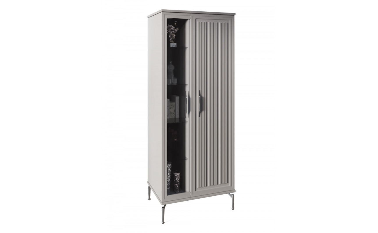 Материал корпусаЛДСП Kronospan 16 мм | Материал фасадаМДФ с фрезеровкой и вставкой из пластика под латунь/хром + стеклянная дверь с фрезеровкой МДФ; Стекло: С тонировкой бронзато | НаполнениеШкаф разделен на 2 секции: за щитовой дверью – 4 щитовые полки, за дверью со стеклом – 4 стеклянные полки; |