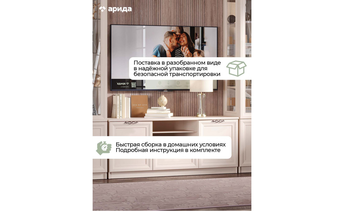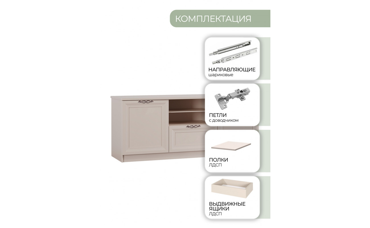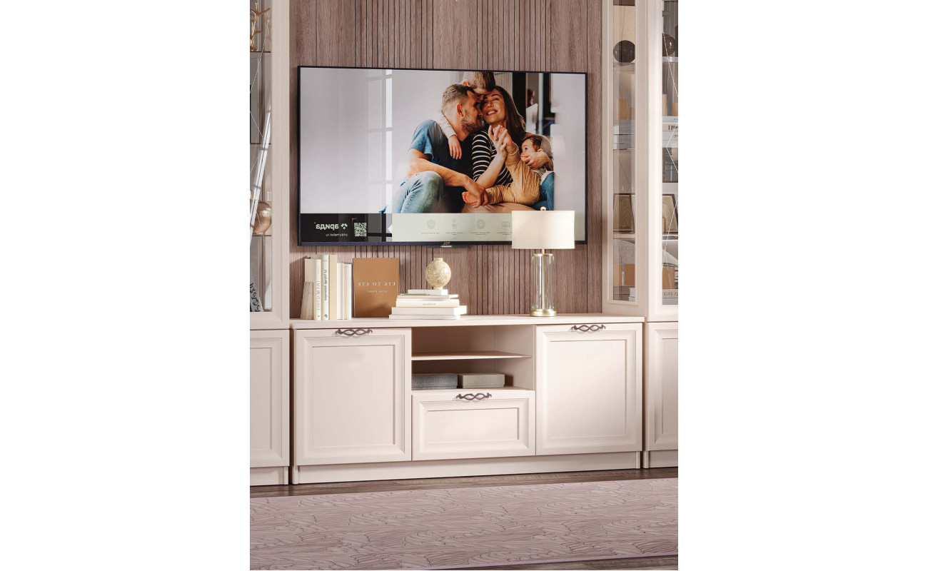 ТВ-тумба «Адель» — не просто место для техники, а центральное звено в интерьере, которое объединяет эстетику и практичность. Её рамочные фасады придают ей структурность и упорядоченность, подчёркивая сдержанную элегантность и изысканную симметрию.