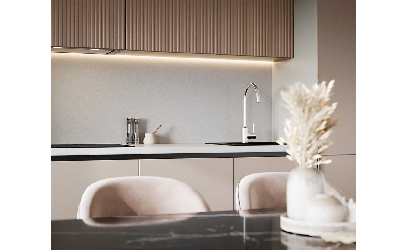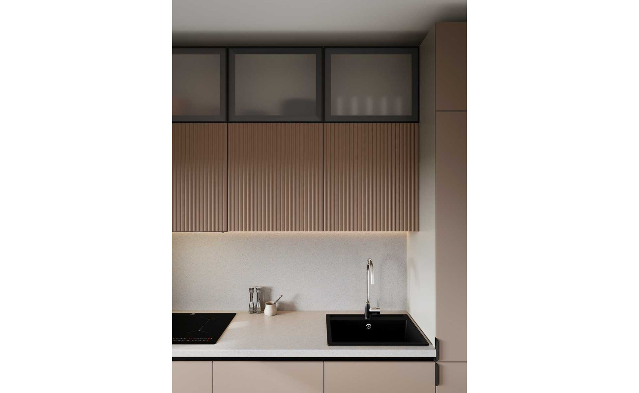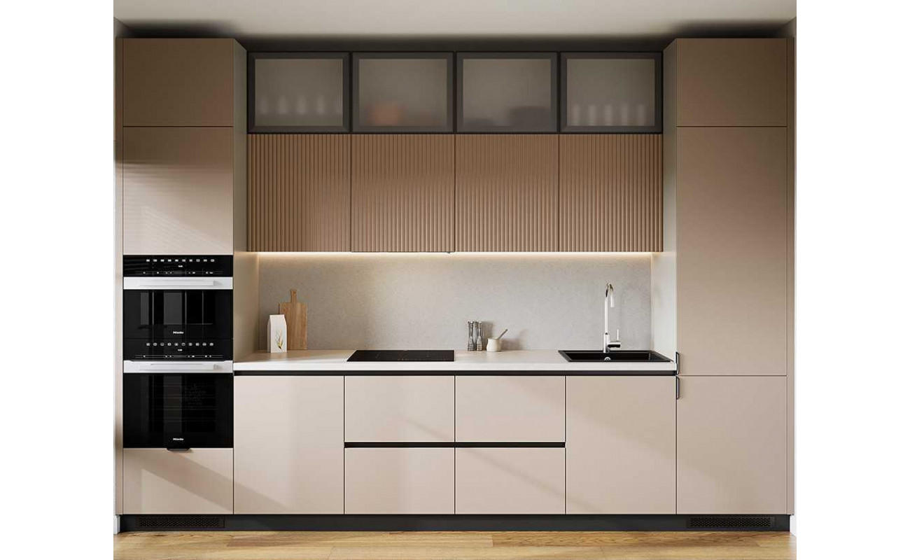 Современное минималистичное решение с механизмами скрытого монтажа и профилем вместо ручек