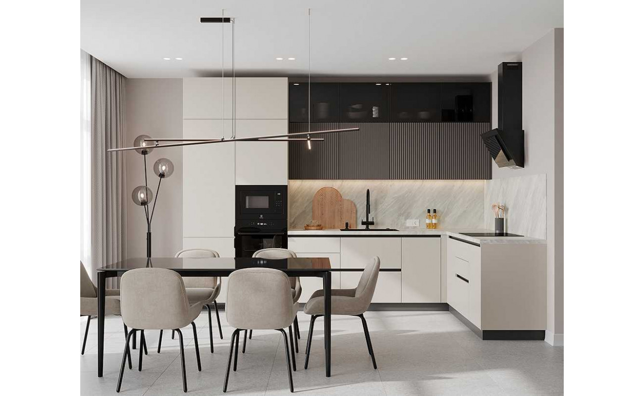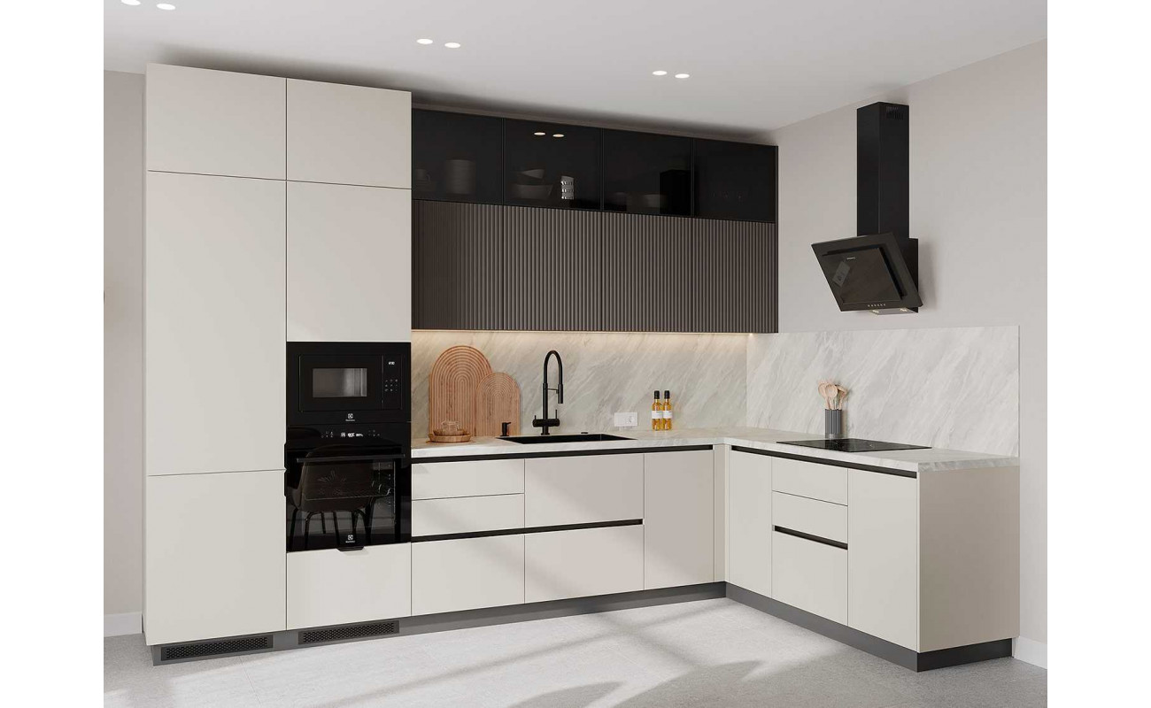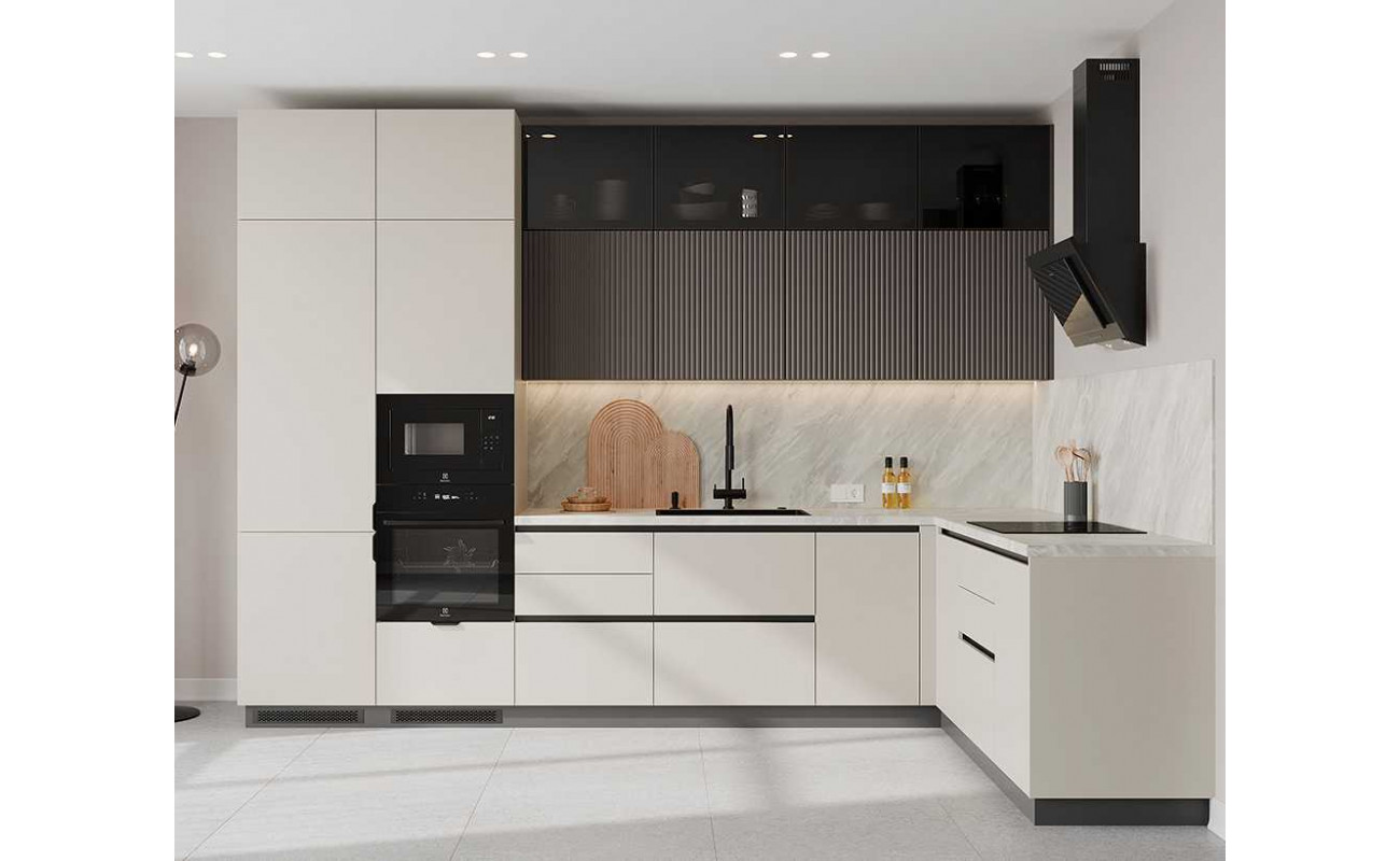 Современное минималистичное решение с механизмами скрытого монтажа и профилем вместо ручек