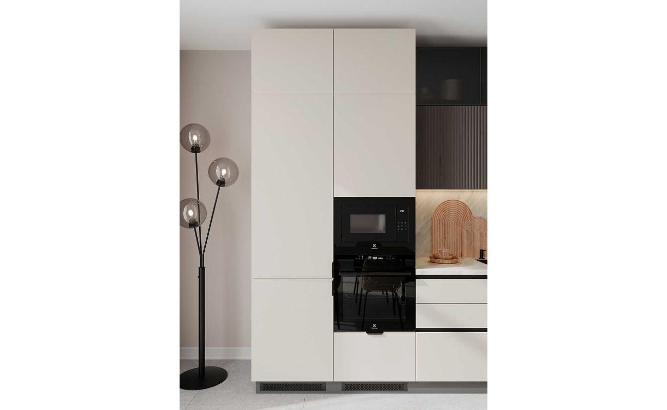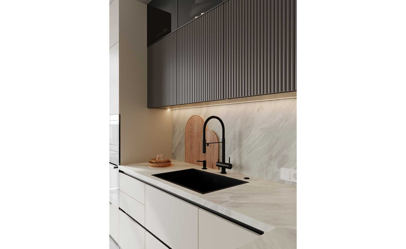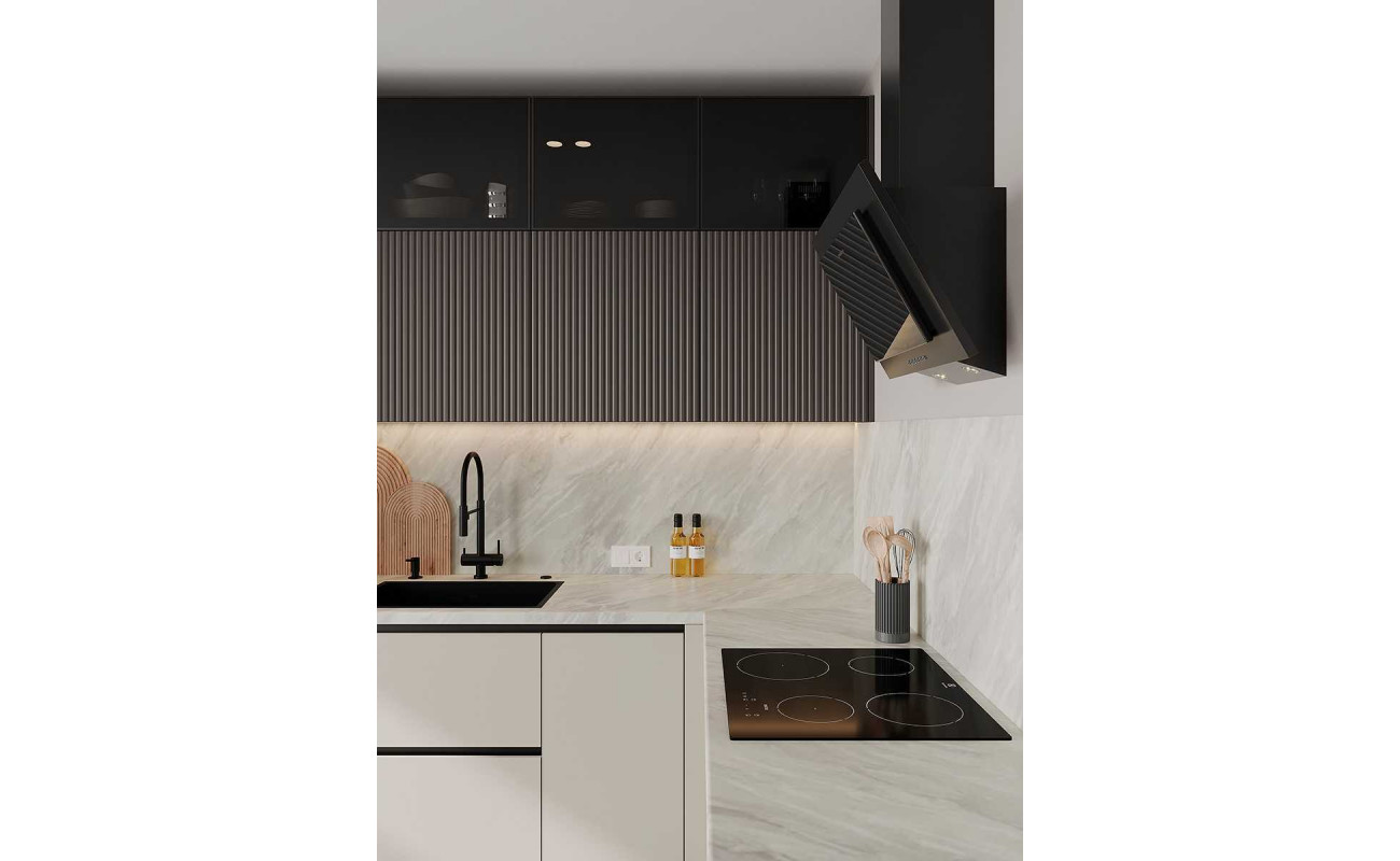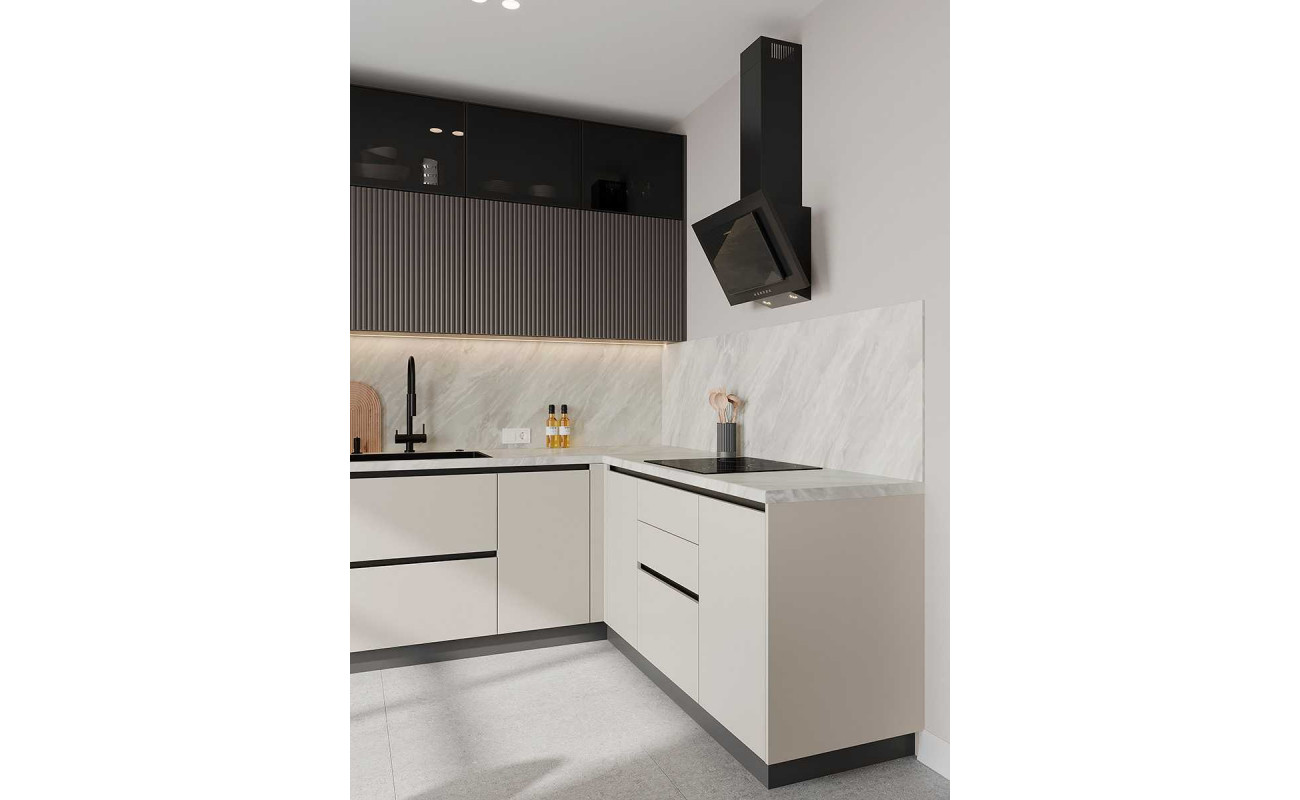 Современное минималистичное решение с механизмами скрытого монтажа и профилем вместо ручек