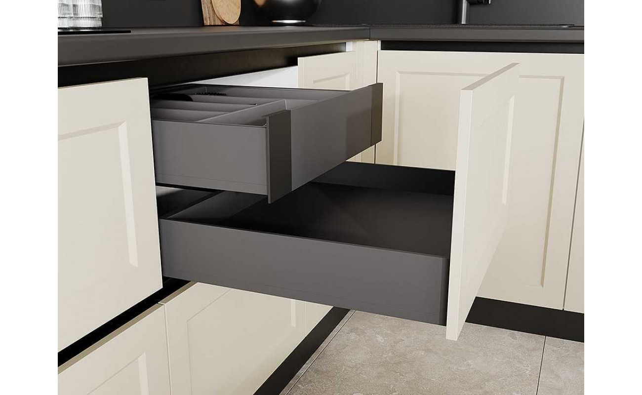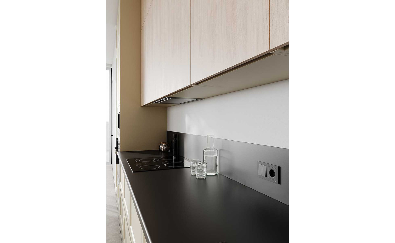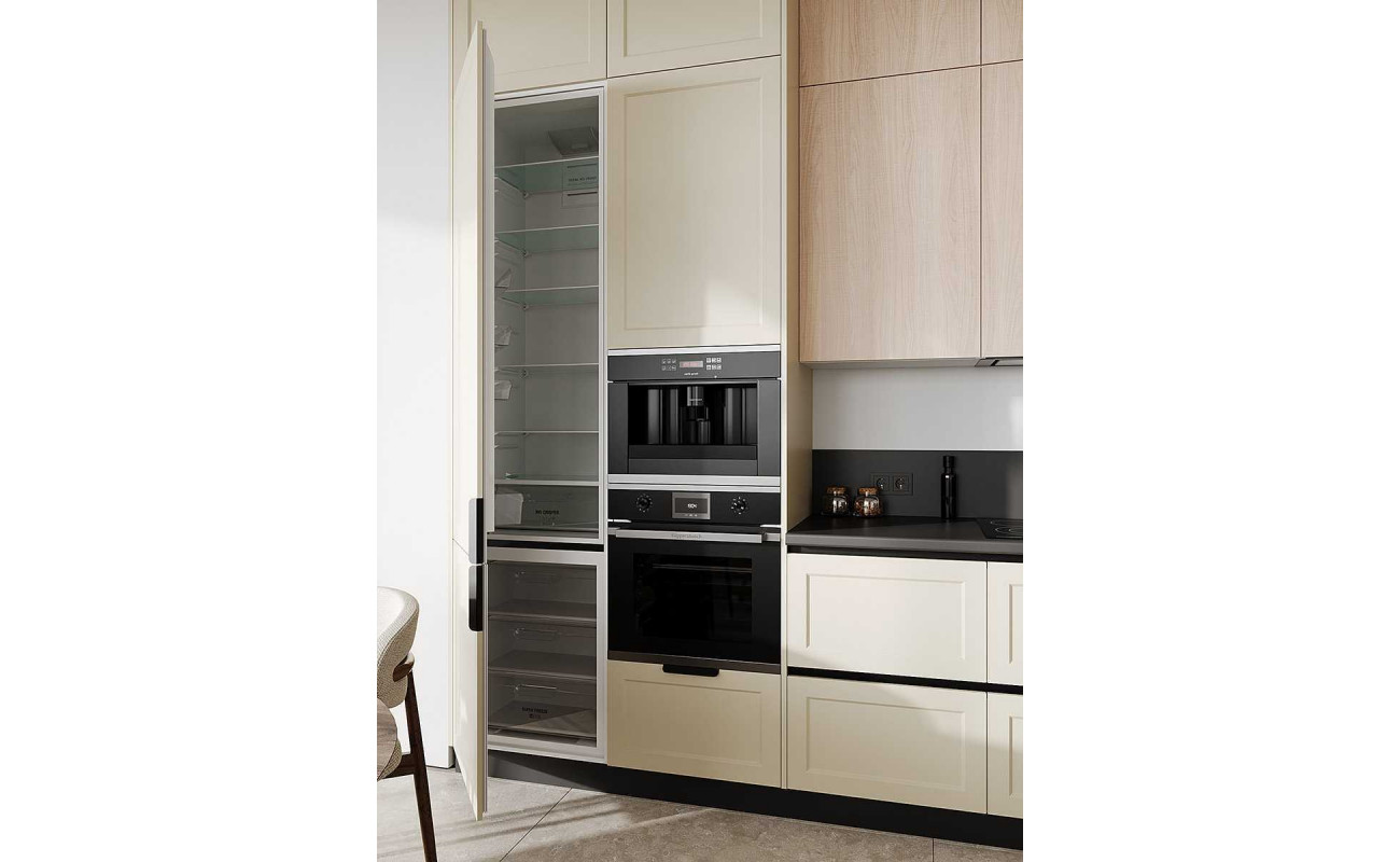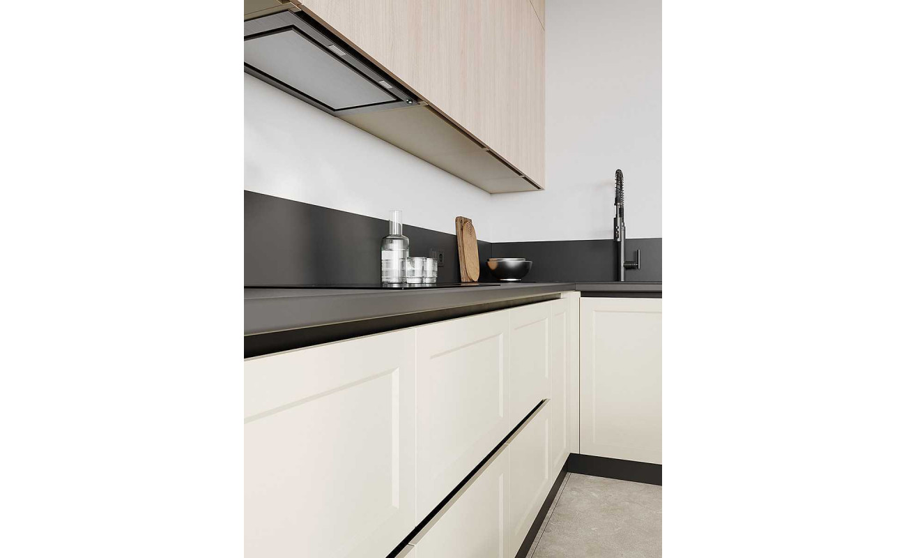 Современное минималистичное решение с механизмами скрытого монтажа и профилем вместо ручек