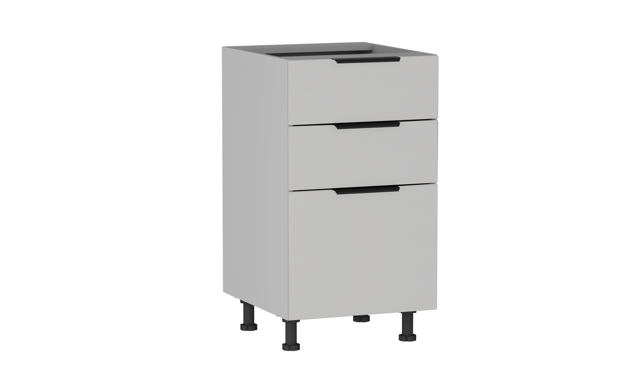 В столе расположены три ящика на шариковых направляющих. Столешница и цоколь приобретается отдельно.