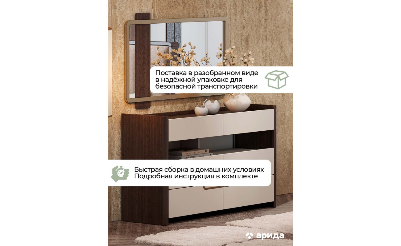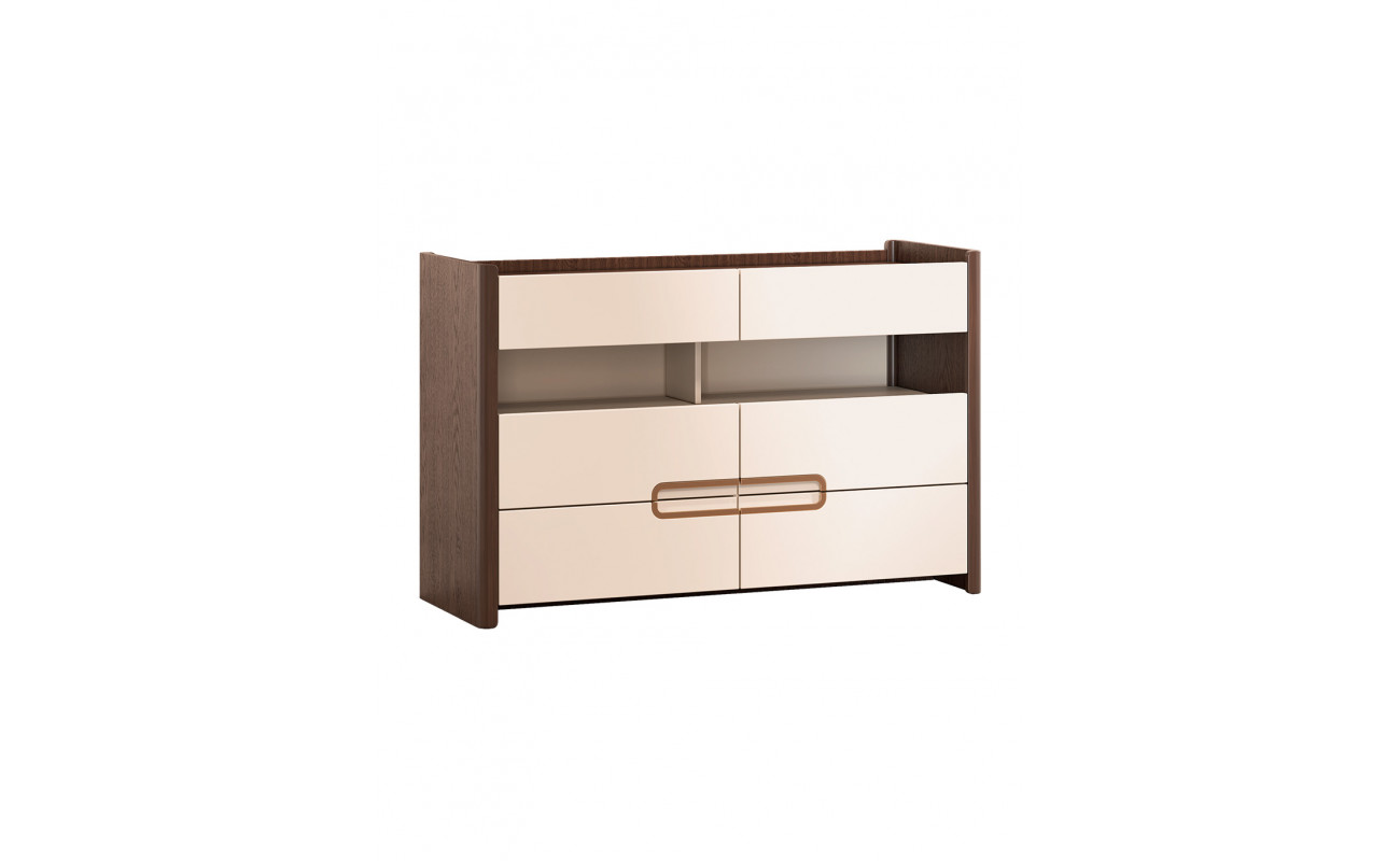 Комод "Диана" с шестью ящиками выполнен в едином стиле с кроватью и зеркалом — мягкие формы, натуральные текстуры и тонкая детализация.