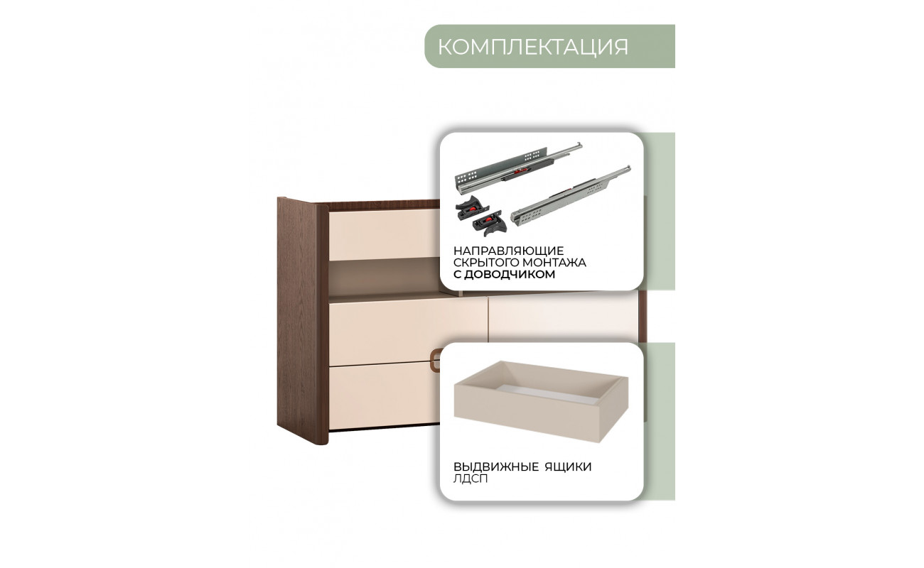 | Фурнитура | Выдвижные ящики оснащены механизмом скрытого монтажа с несущей способностью до 30 кг |