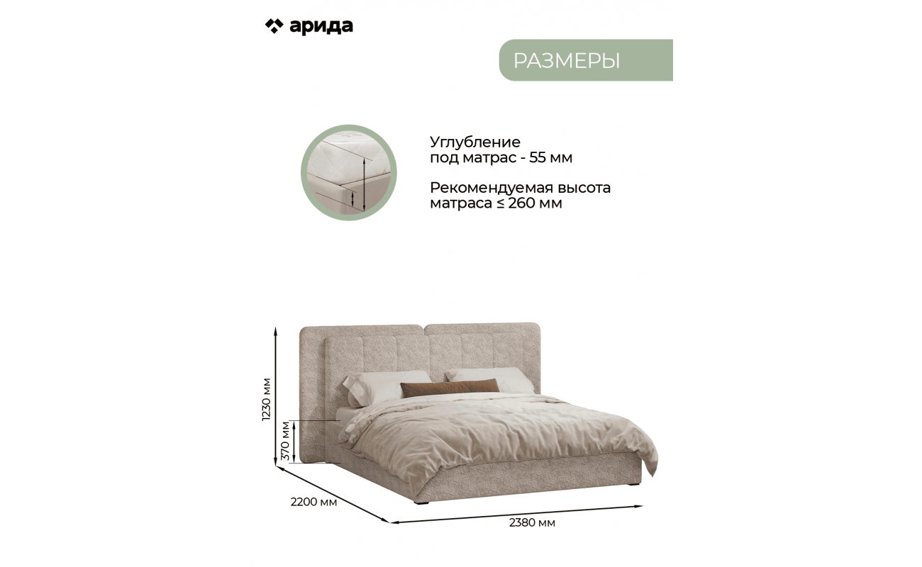 Мягкое изголовье, выполненное в ткани букле, притягивает взгляд своей текстурой и глубиной, добавляя интерьеру современный шик и благородство. Его двойная форма, актуальная и трендовая, подчёркивает индивидуальность гарнитура, делая его не просто мебелью, а настоящим акцентом, который говорит о вашем безупречном вкусе.