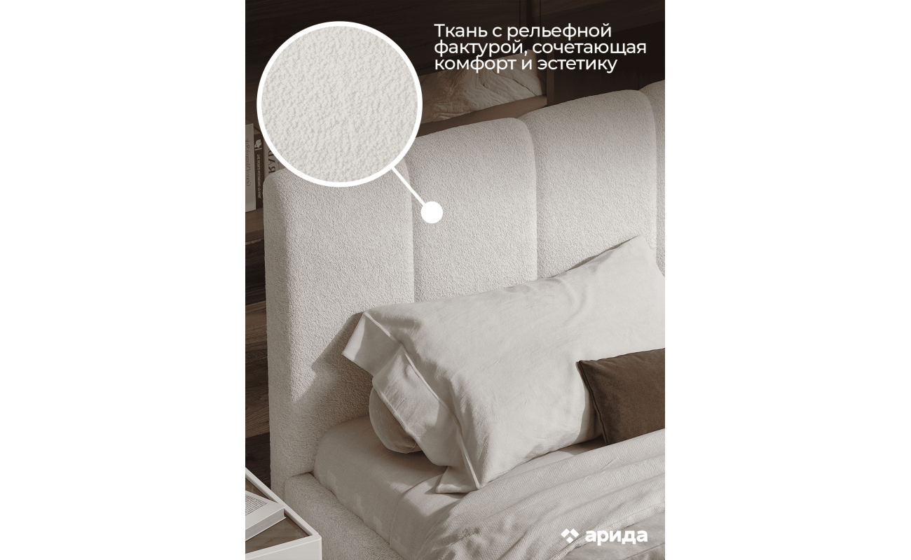| Материал обивки | Утончённый шенилл с невысоким ворсом и букле-эффектом в молочном цвете. Гармоничные натуральные тональности, необычная фактура и мягкость материала наделяют интерьер спокойствием и уютом |