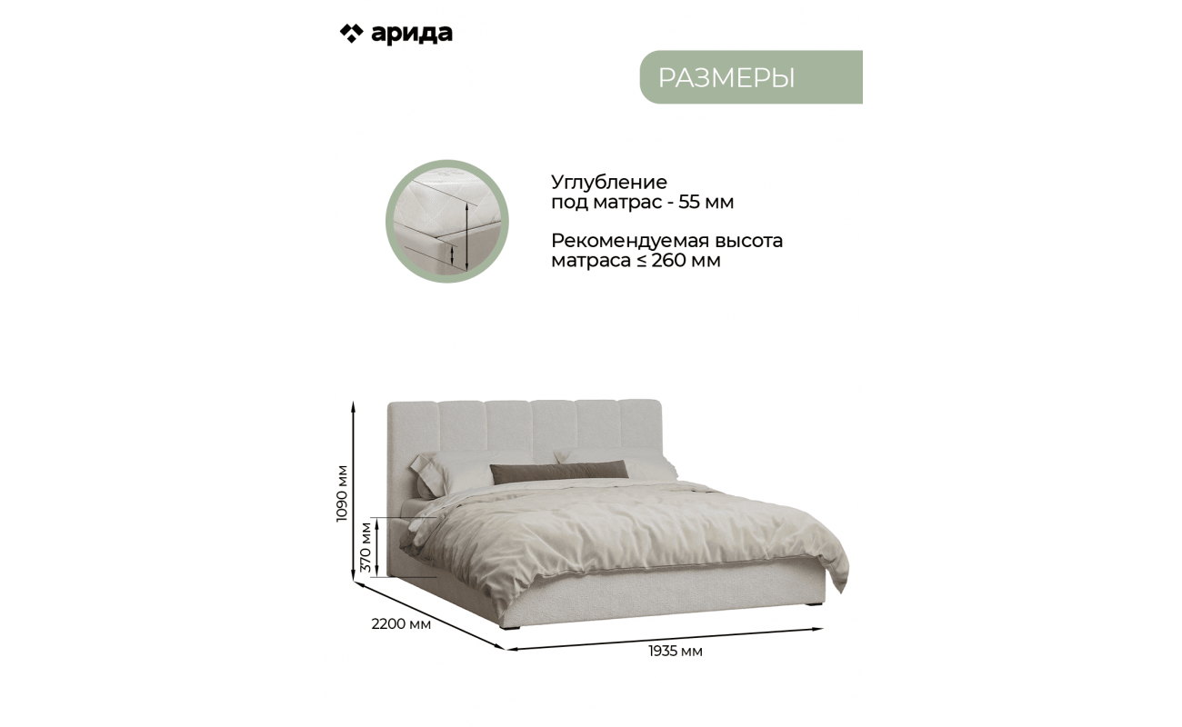 | Размеры(ШxГxВ)194х222х109 см | Спальное место (см)180х200 | Ширина1935 мм |