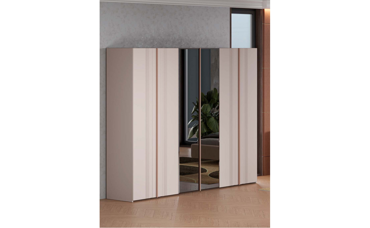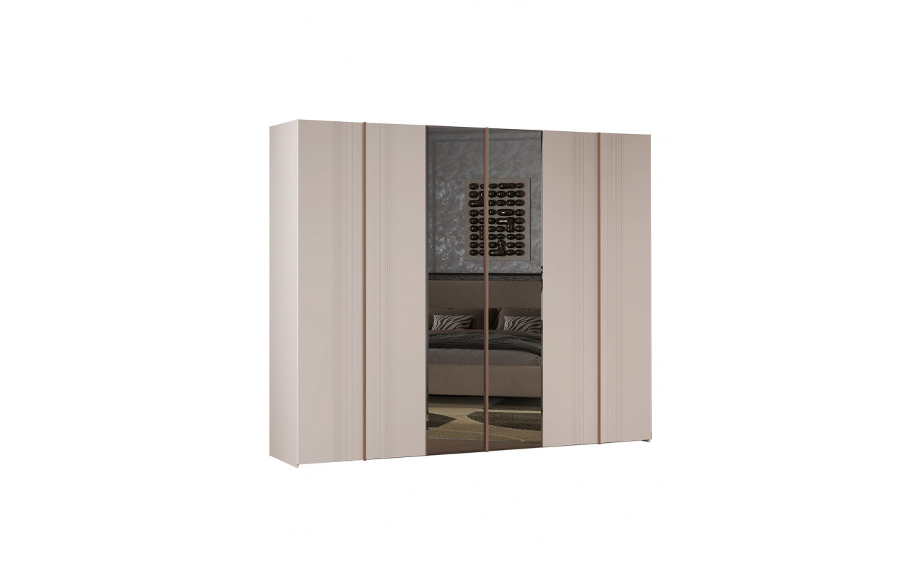 "Шкаф «Виктория» с фрезерованными фасадами, центральными зеркальными вставками и профильной ручкой — сбалансированное решение: зеркало в центре визуально расширяет пространство, фрезеровка добавляет текстуру, а тонкая ручка сохраняет лаконичность.
