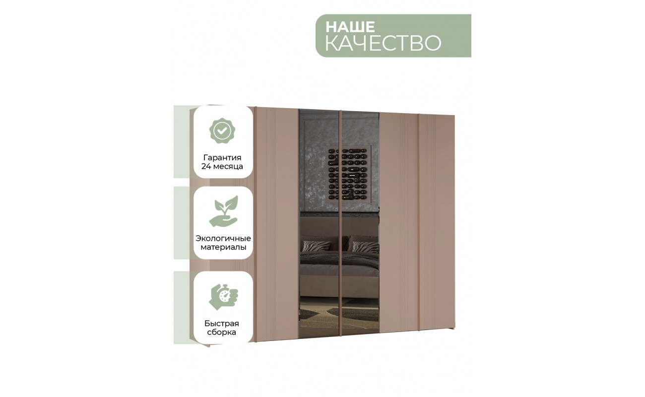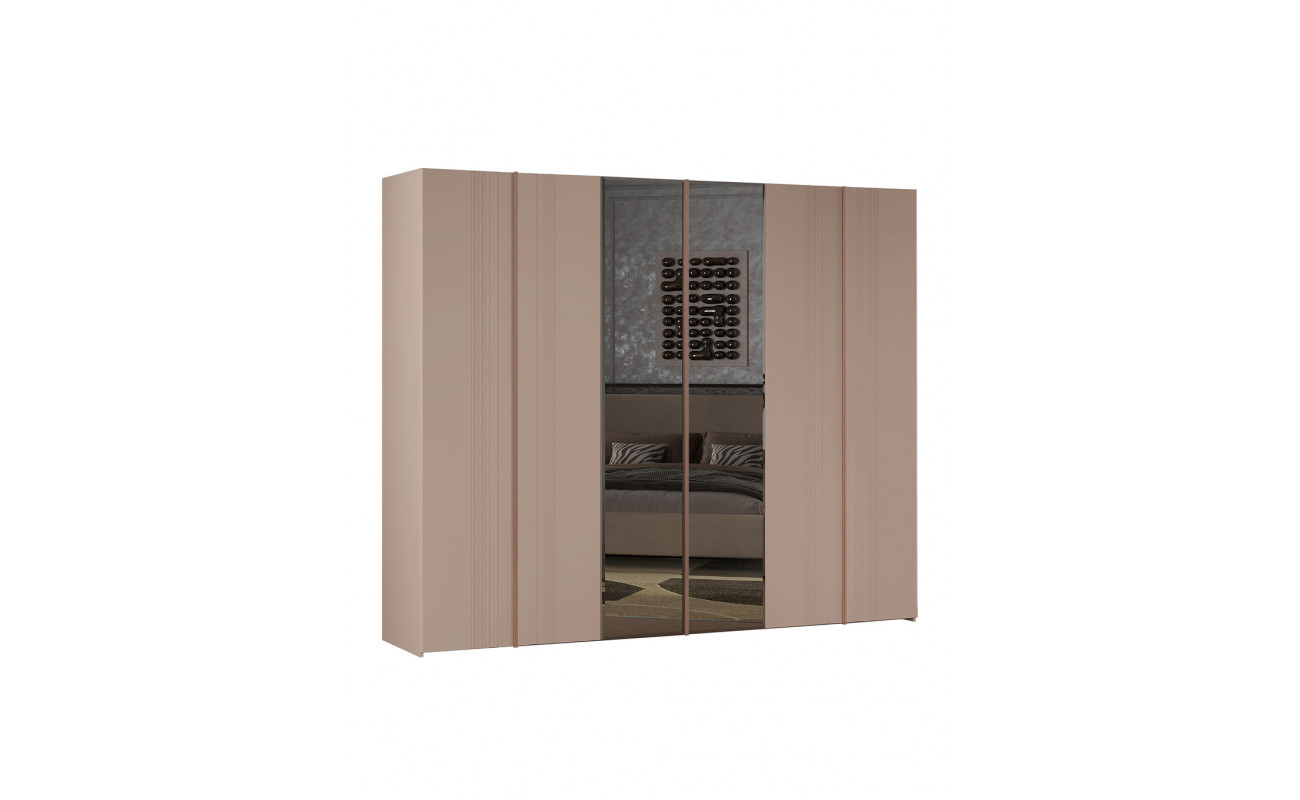 "Шкаф «Виктория» с фрезерованными фасадами, центральными зеркальными вставками и профильной ручкой — сбалансированное решение: зеркало в центре визуально расширяет пространство, фрезеровка добавляет текстуру, а тонкая ручка сохраняет лаконичность.