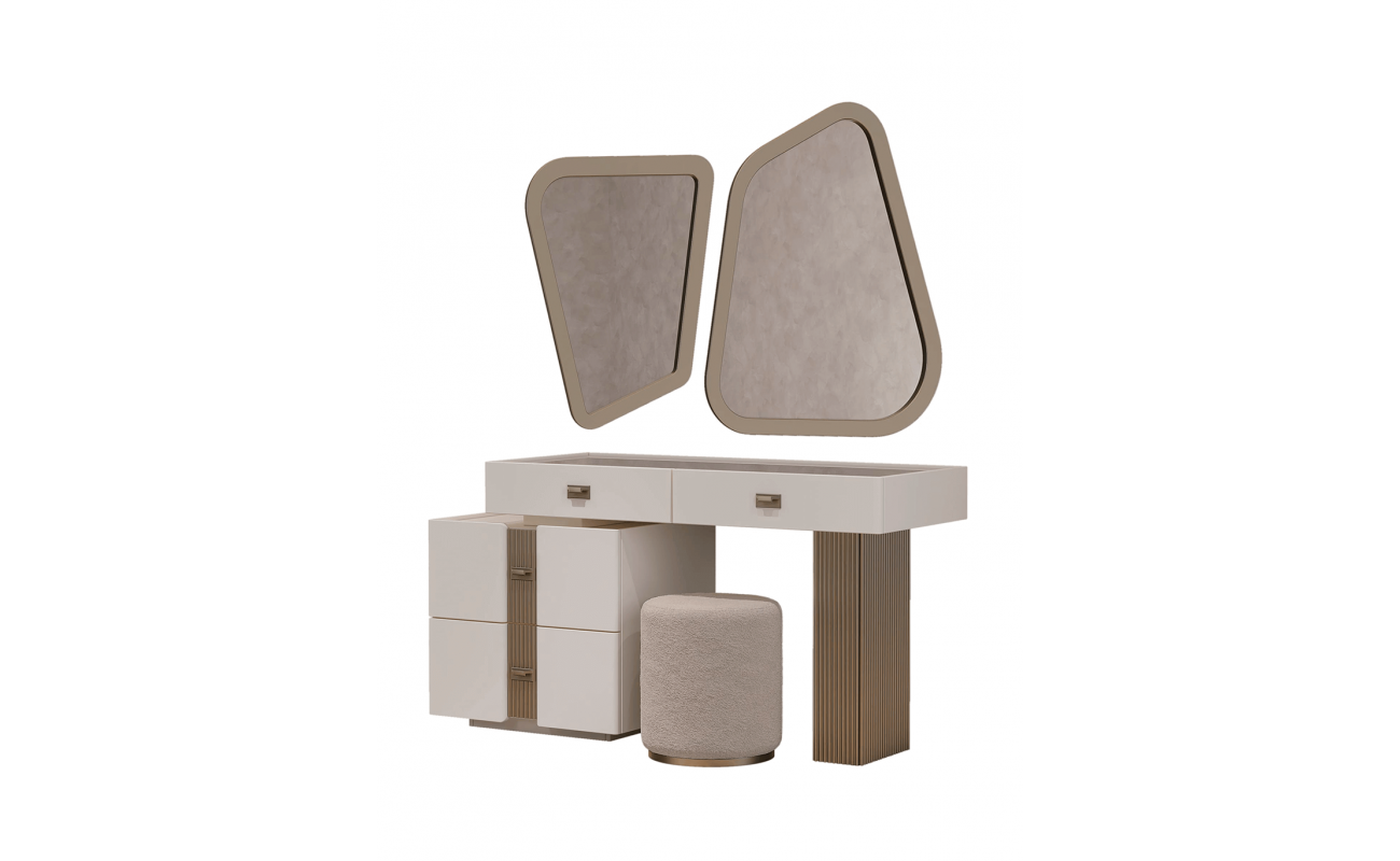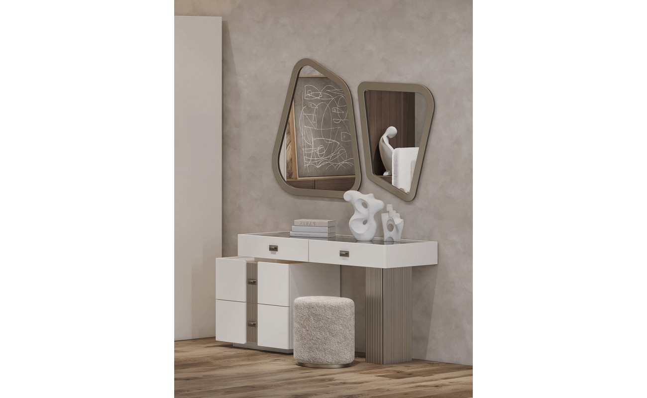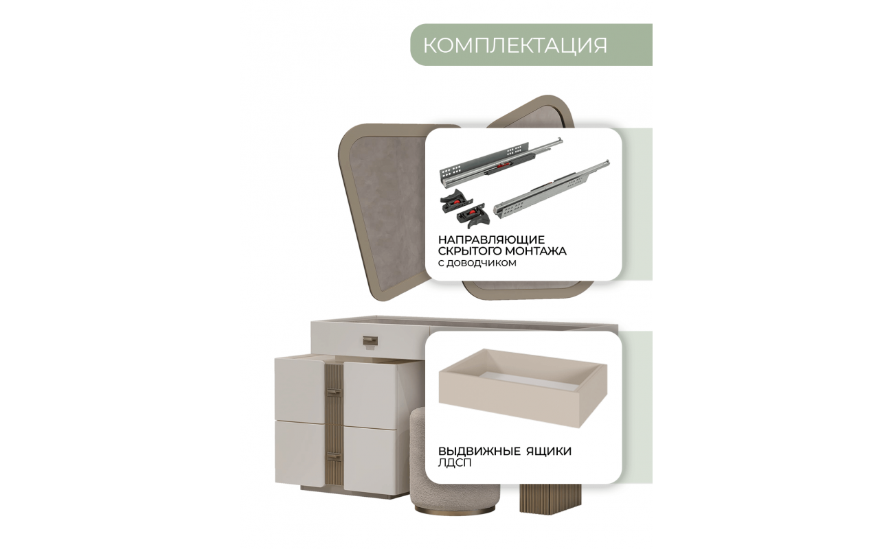 Туалетный стол "Леонардо" оснащен выдвижными ящиками, которые обеспечивают удобное хранение косметики, аксессуаров и других необходимых вещей.