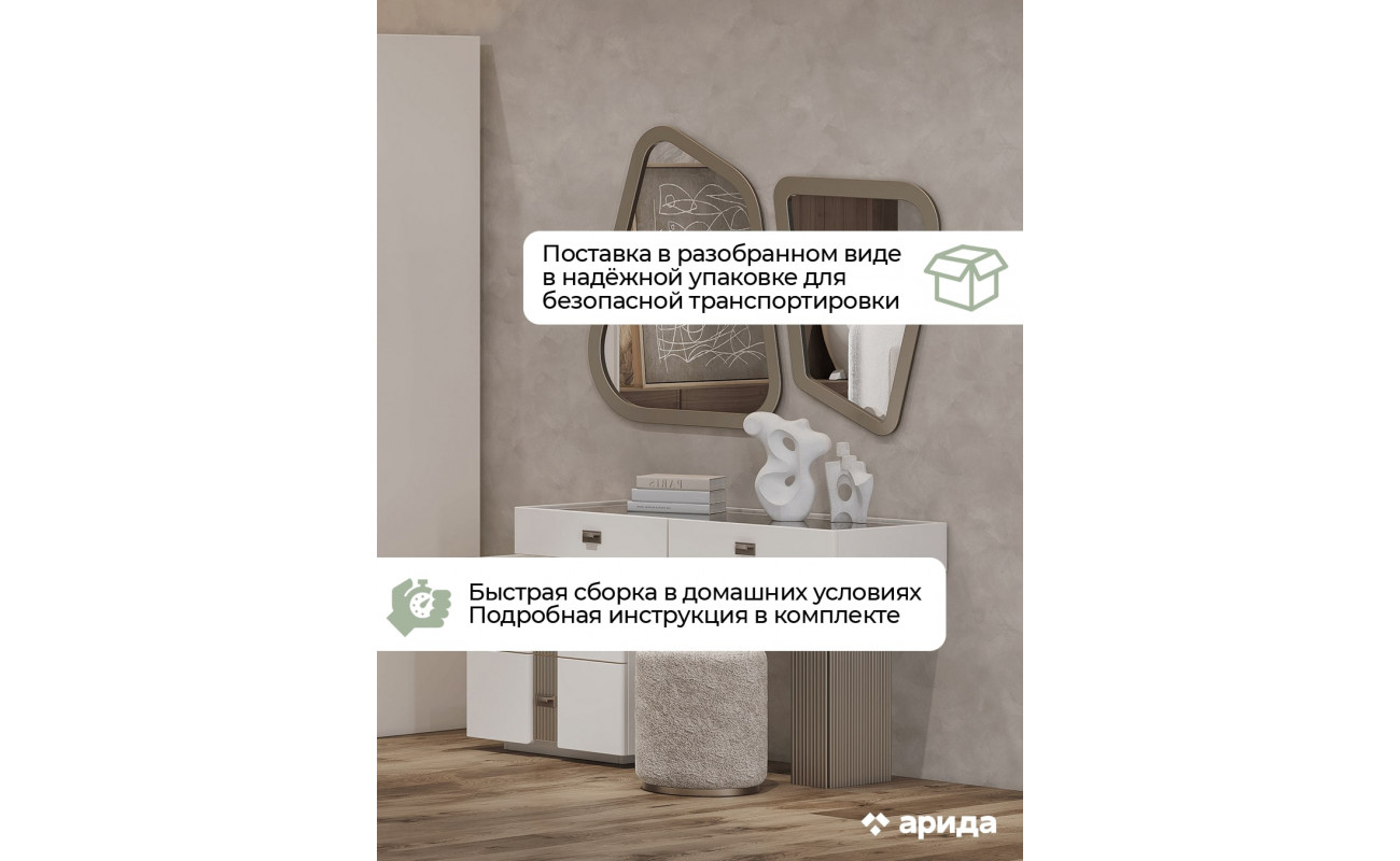 Необычный дизайн зеркала становится центральным акцентом, привнося оригинальность и индивидуальность в интерьер. Зеркало не только функционально, но и служит декоративным элементом, который привлекает внимание и добавляет шарм. Используемый в качестве стула пуф можно задвигать под стол с целью высвобождения пространства.