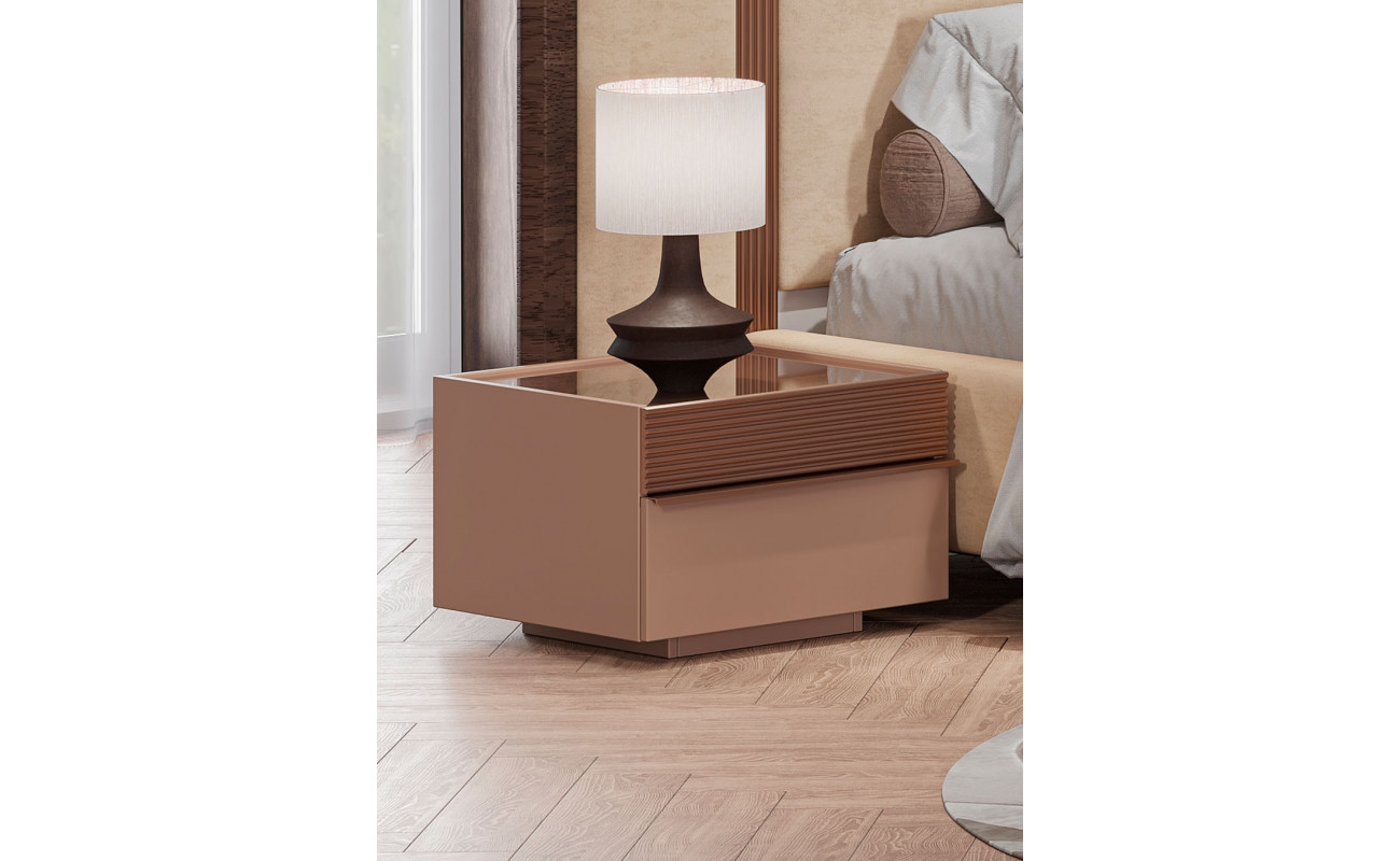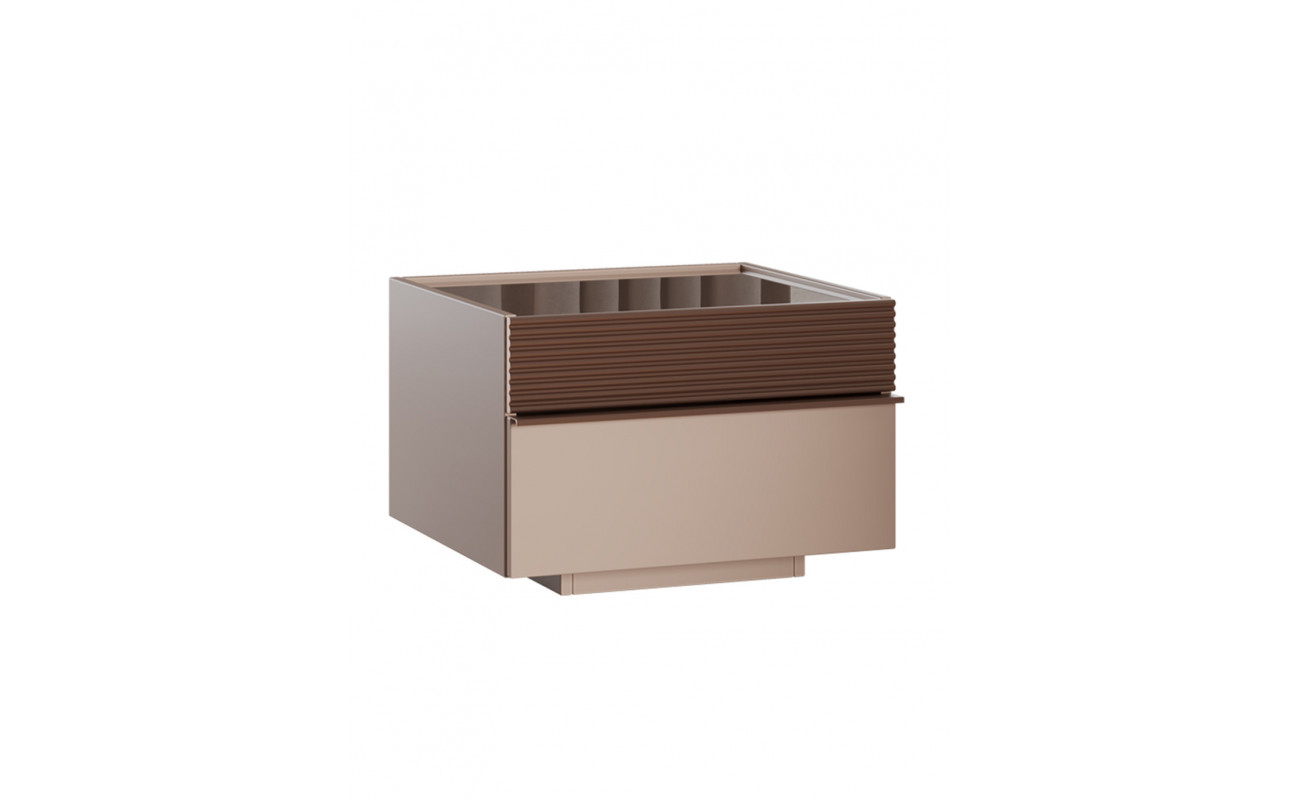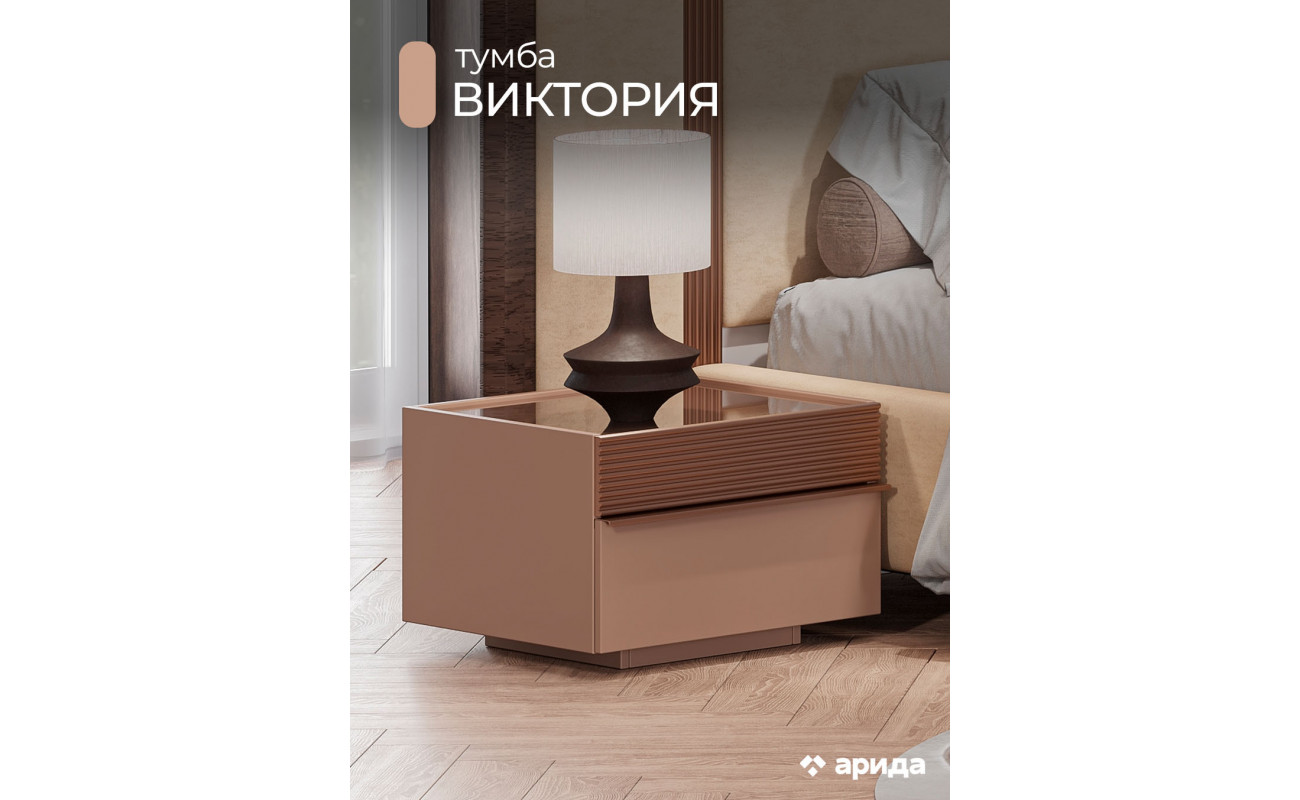 Тумба «Виктория» с фрезерованным фасадом и тонированным стеклом на крышке — стильное и функциональное решение. Тонированное стекло добавляет глубину и лёгкую игривость, контрастируя с текстурой фрезеровки, а сохраняя минимализм и стиль коллекции.