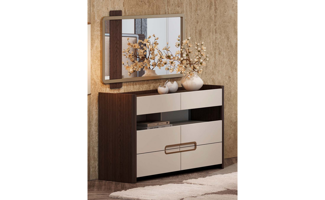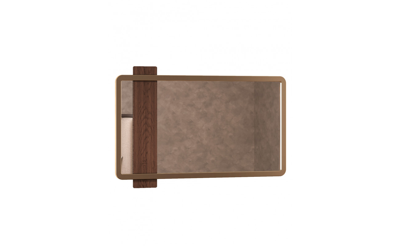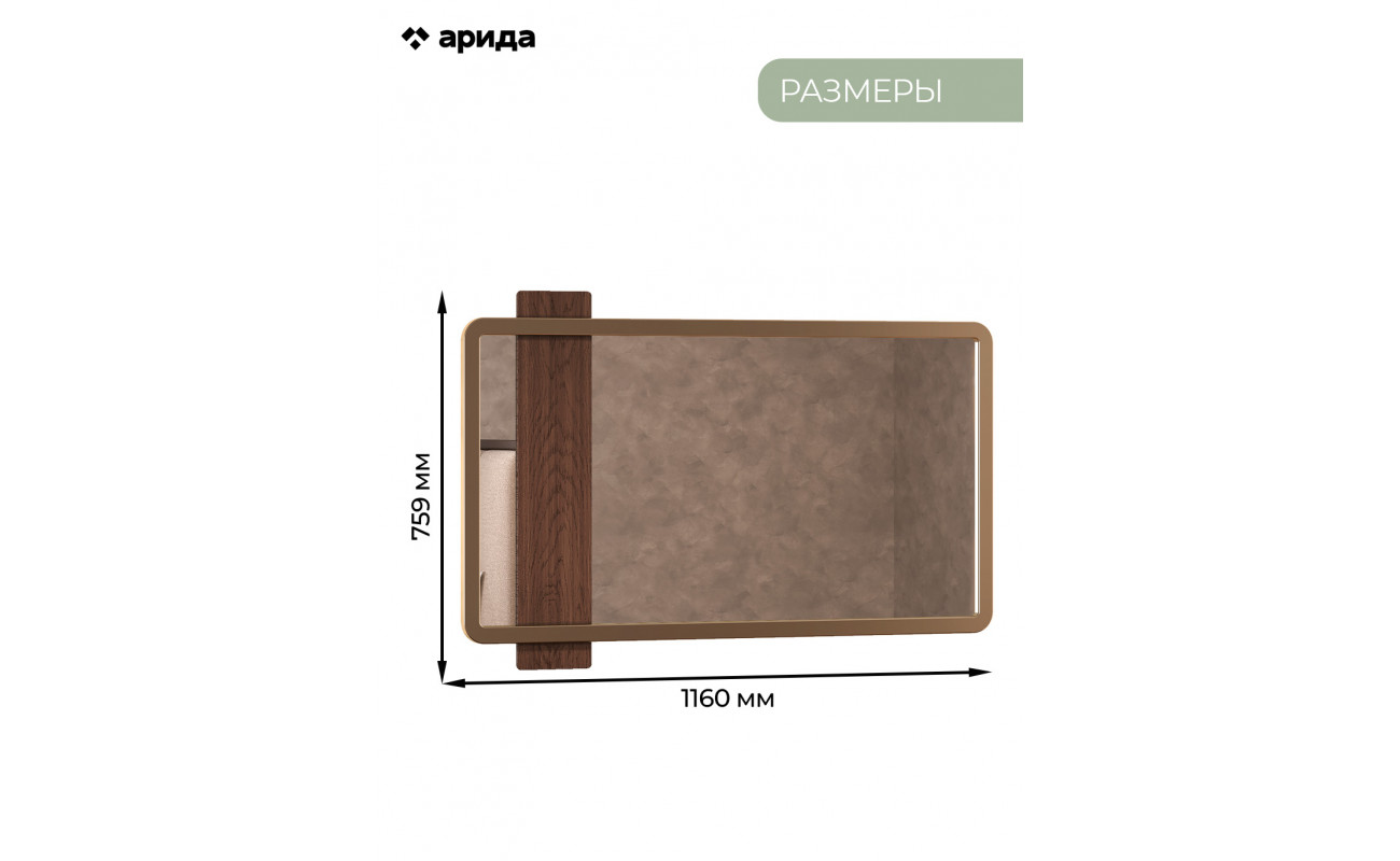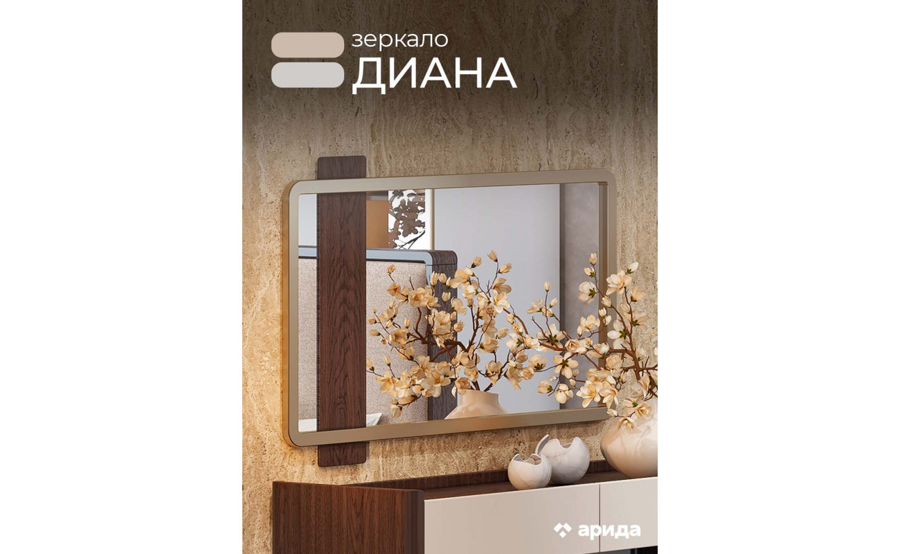 Зеркало "Диана" оформлено в рамке со скруглёнными краями и вертикальным декором под венге. Это добавляет изделию изысканности и гармонично сочетается с мягким изголовьем кровати, создавая единый, тёплый и утончённый ансамбль.