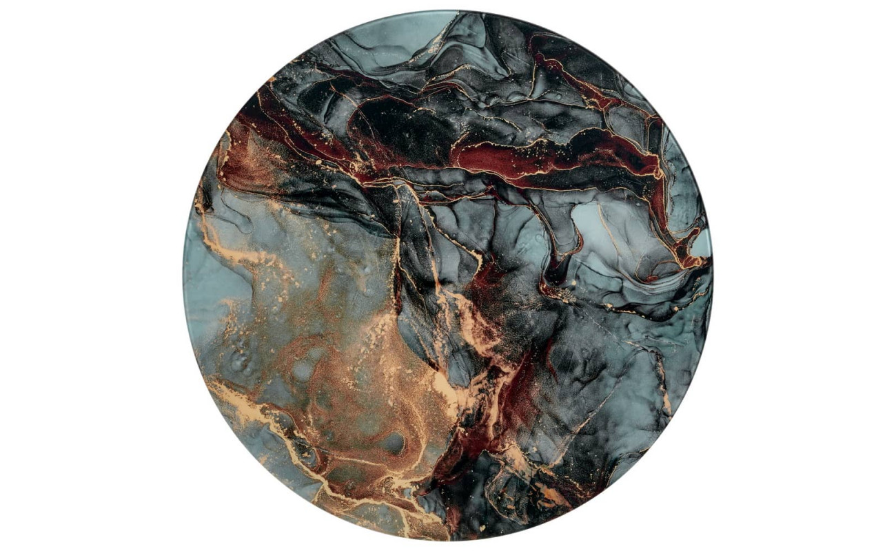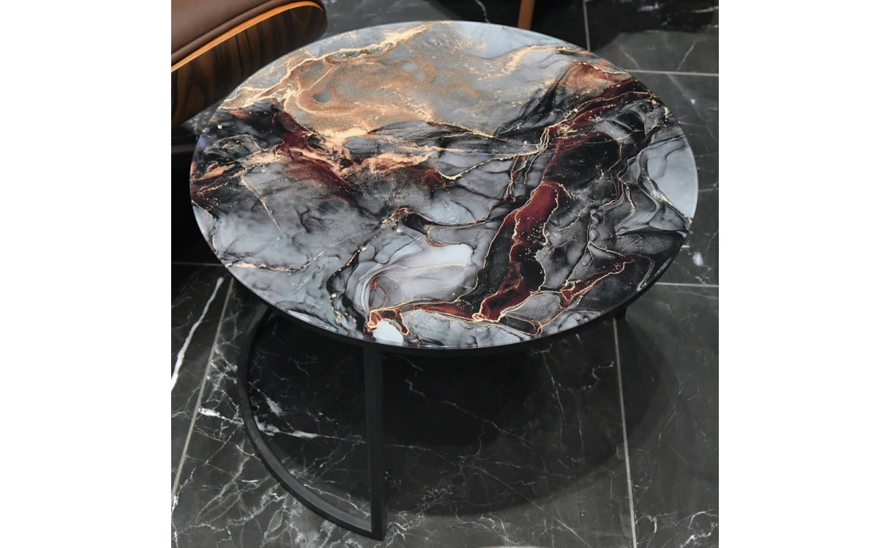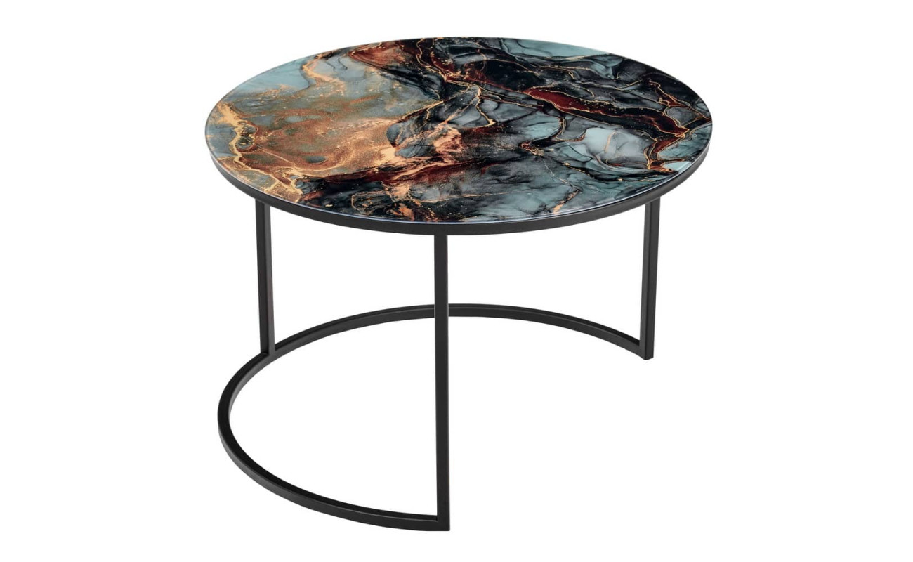 Элегантная пара кофейных столиков Tango станет изящным дополнением любой гостинной или даже спальни. Рисунок на столешнице, выполенной из закалённого стекла, завораживает и притягивает взгляд. Столики можно расположить парой или расставить по отдельности. Чёрные ножки позволят вписать этот набор в любой интерьер. Размер большого столика: диам.60х41см. Размер маленького столика: диам.47,5х31см