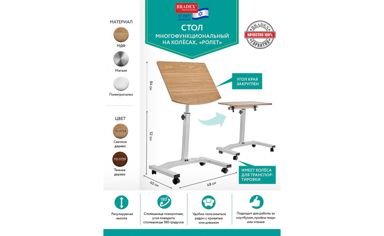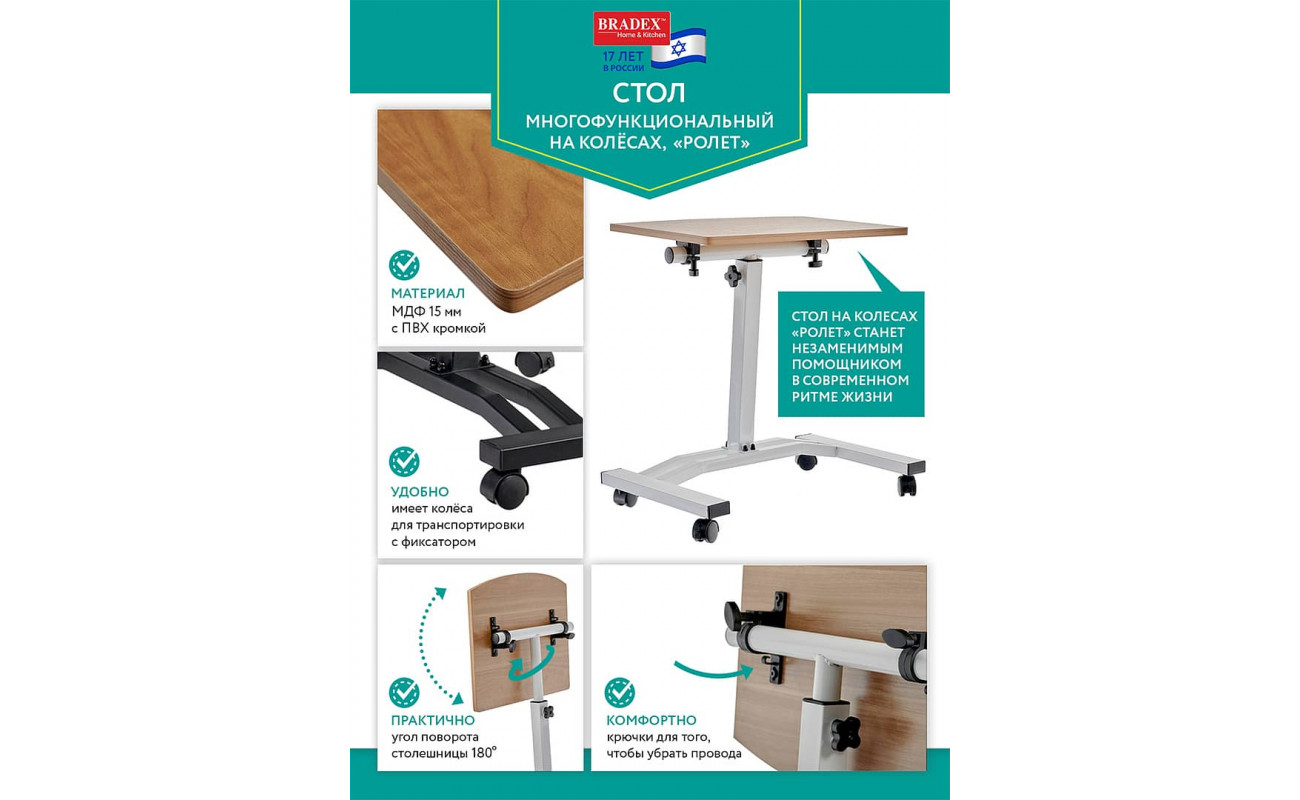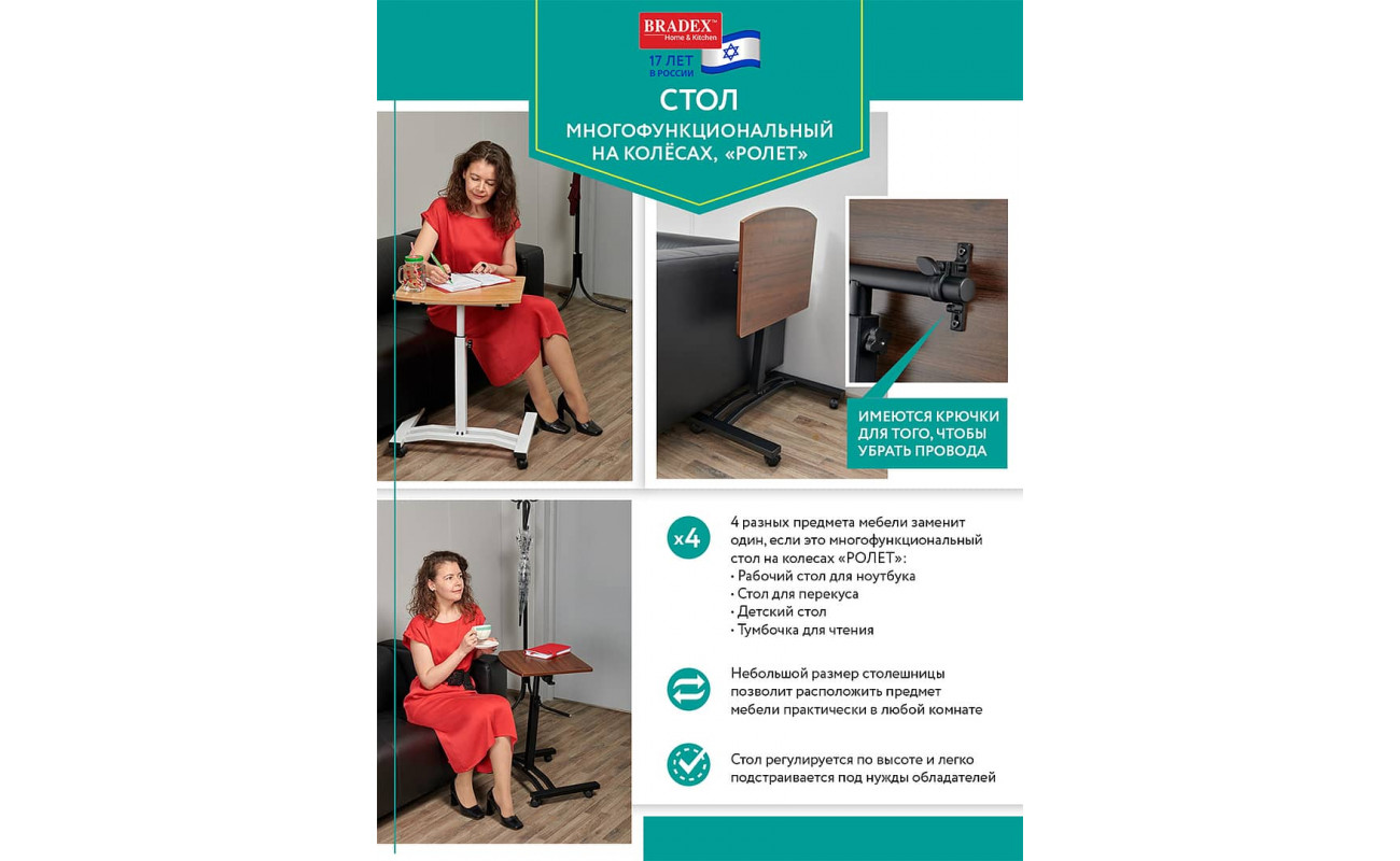 Рабочий стол для ноутбука, стол для перекуса, детский стол и тумбочка для чтения — 4 разных предмета мебели может заменить один, если это многофункциональный стол на колесах РОЛЕТ. Стол имеет колесики, благодаря чему легко может перемещаться по дому, занимая отведенное ему место. Небольшой размер столешницы позволит расположить предмет мебели практически в любой комнате. Стол регулируется по высоте и легко подстраивается под нужды обладателей. Удобный и практичный, многофункциональный стол на колесах РОЛЕТ станет незаменимым помощником в современном ритме жизни.