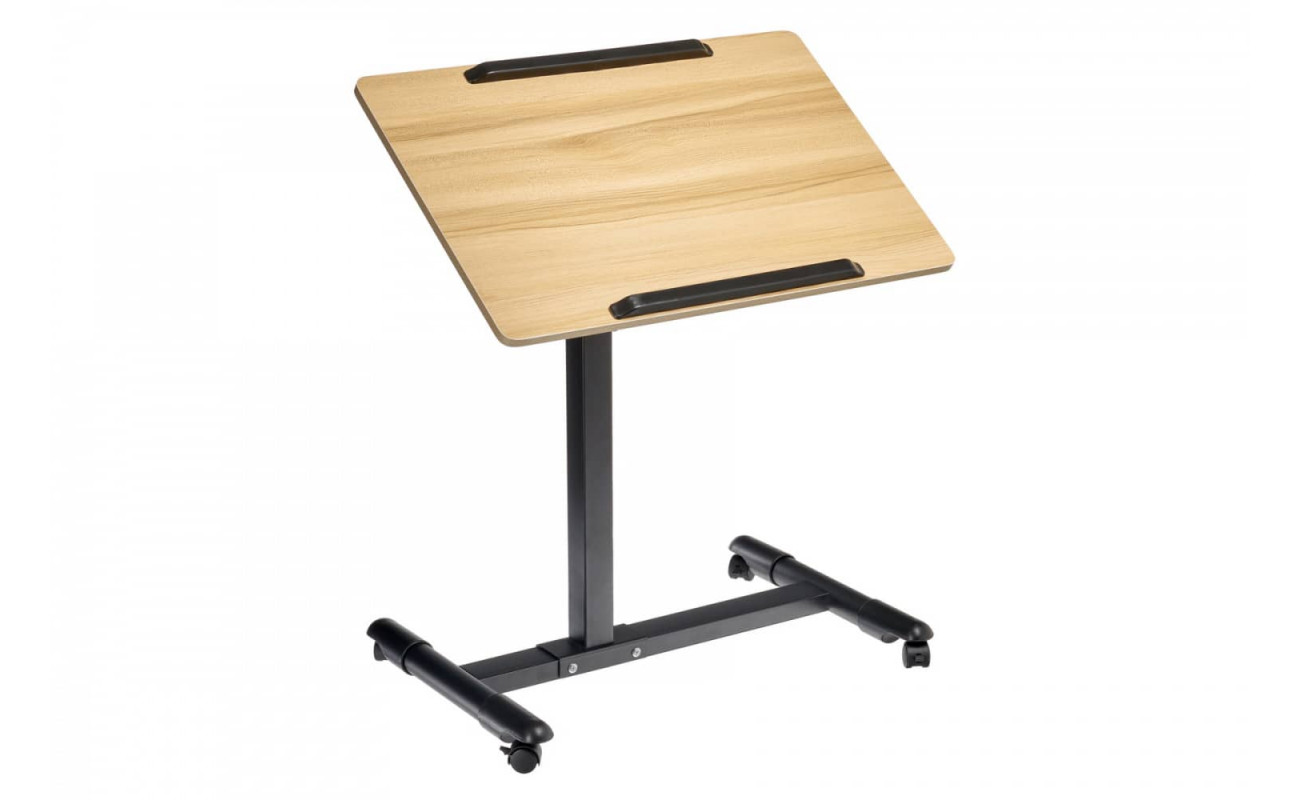 Столик оборудован поворотной столешницей из МДФ и металлическим основанием. Угол поворота столешницы составляет 180°, вплоть до вертикального положения. Высота подъема регулируется в диапазоне от 65 до 97 см. На столешнице имеются ограничители для ноутбука, планшета, предотвращающие падение гаджета.