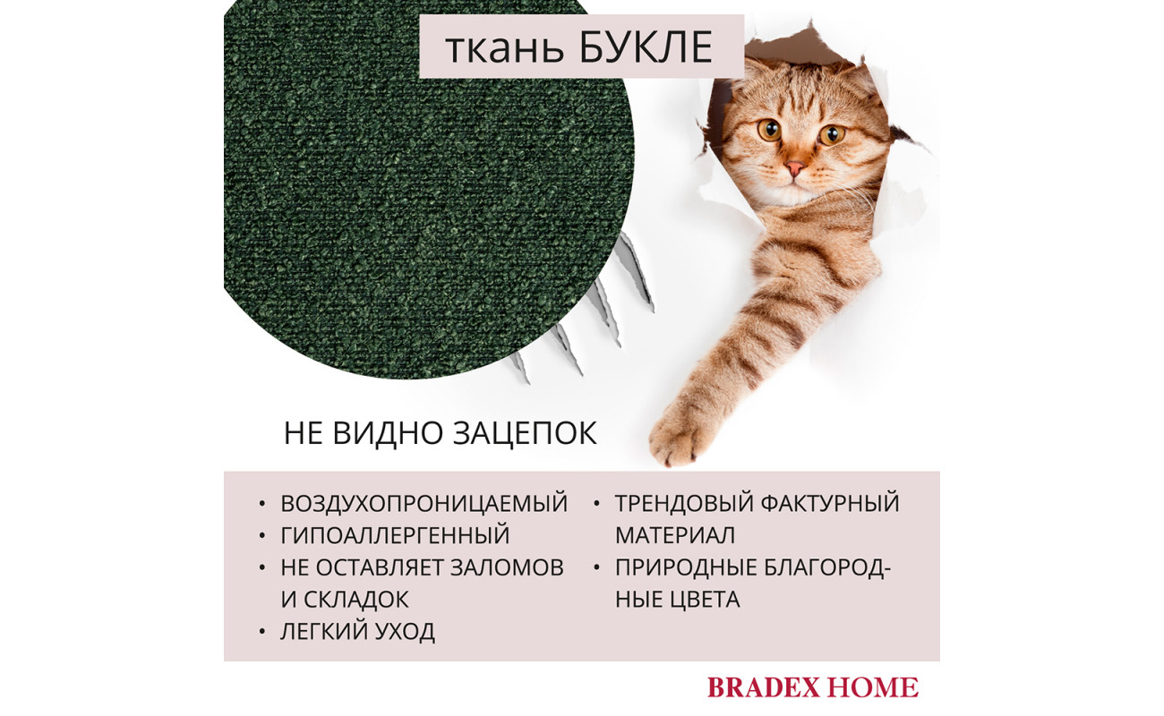 Букле: Этот трендовый фактурный материал отличается природными благородными цветами, нежным комфортом и гипоаллергенностью. Букле устойчив к сминанию, не оставляет заломов и складок, легко очищается и хорошо пропускает воздух.