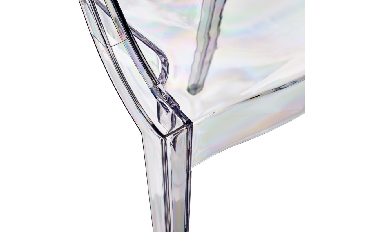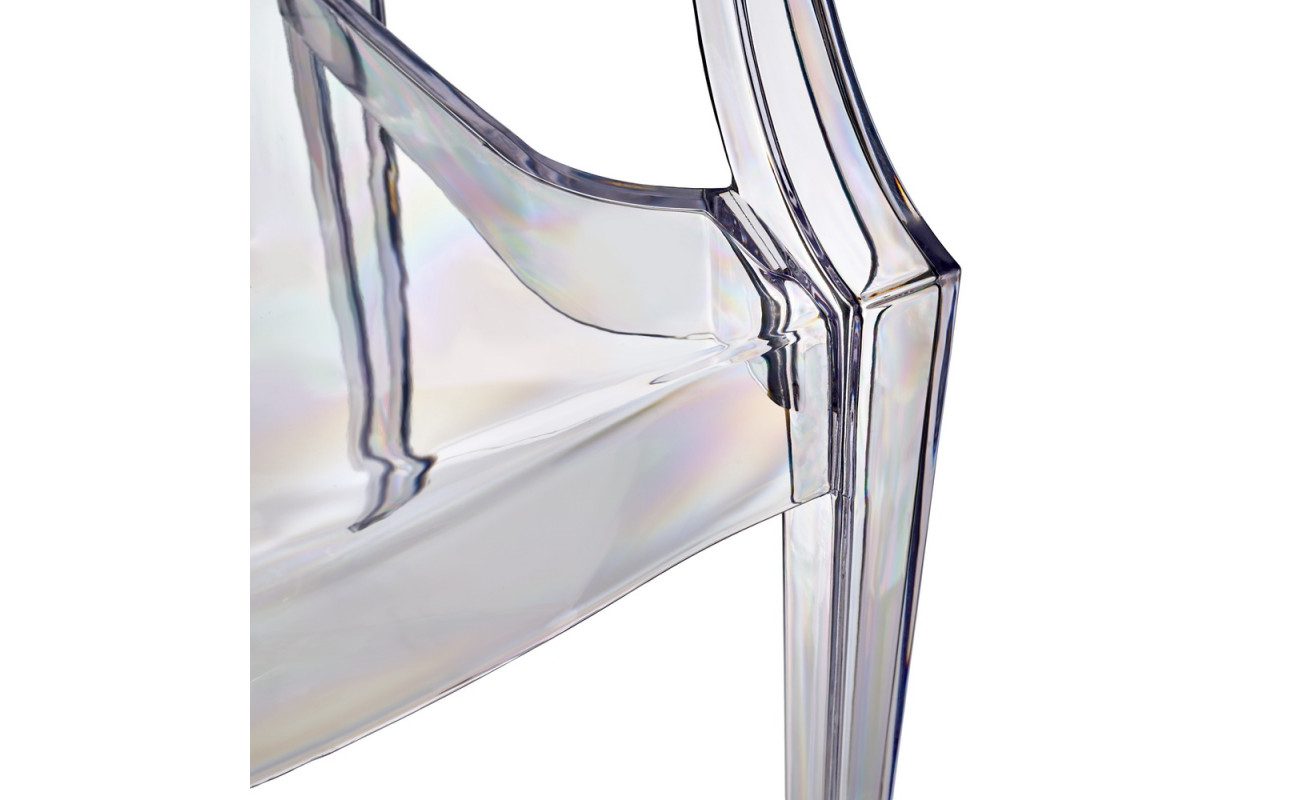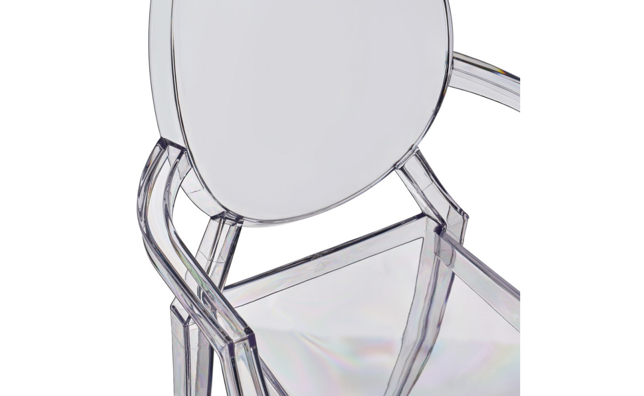 Стул изготовленный из литого полупрозрачного поликарбоната в сочетании с классическими формами спинки и подлокотников - это пример успешного сочетания классических форм и современной индустрии производства.